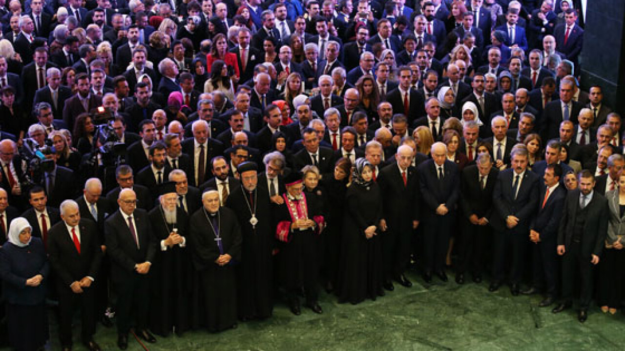 Erdoğan çifti, salona gelişlerinin ardından TBMM Başkanı İsmail Kahraman, Başbakan Binali Yıldırım ve eşi Semiha Yıldırım, Genelkurmay Başkanı Orgeneral Hulusi Akar ve eşi Şule Akar, MHP Genel Başkanı Devlet Bahçeli, eski Başbakan Tansu Çiller ve eşi Özer Uçuran Çiller, eski Başbakan Yıldırım Akbulut, eski TBMM Başkanları Bülent Arınç ve Köksal Toptan, BBP Genel Başkanı Mustafa Destici ve eski bakanlardan Hasan Celal Güzel ile selamlaşarak sohbet etti.