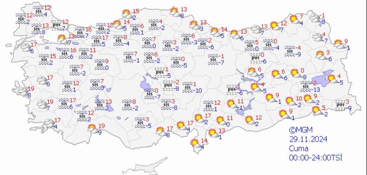 Meteoroloji Genel Müdürlüğü’nün tahminlerine göre, 29 Kasım 2024 Cuma günü Türkiye genelinde hava durumu şu şekilde olacaktır: