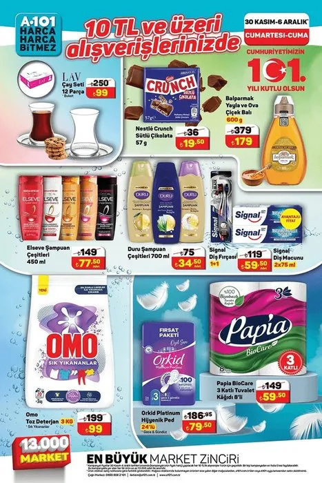 A101'in 30 Kasım - 6 Aralık tarihleri arasındaki indirimli ürün listesi, alışveriş listenize kolaylık katıyor. Ev ihtiyaçlarından kişisel bakıma, gıda ürünlerinden temizlik malzemelerine kadar birçok farklı kategoride uygun fiyatlı ürünler yer alıyor.