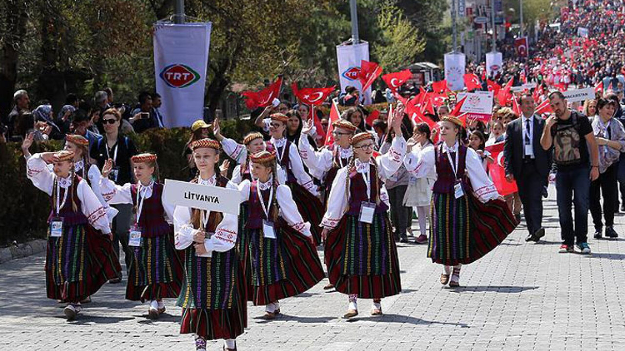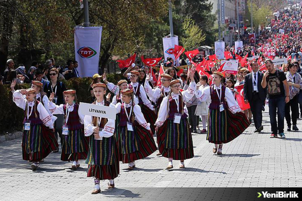 Borsa Kavşağı'nda toplanan yerli ve yabancı yüzlerce çocuk, yöresel kıyafetleriyle ve ellerinde ülkelerine ait bayraklarla yürüyüşe katıldı.