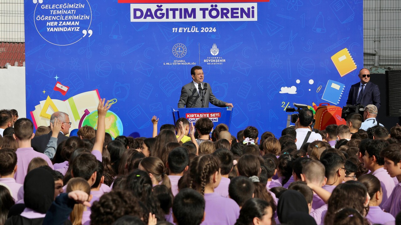 Okul bahçesinde toplanan öğrenciler, törene katılan Türkiye Belediyeler Birliği (TBB) ve İBB Başkanı Ekrem İmamoğlu’na sevgi gösterilerinde bulundu. Bayrampaşa Belediye Başkanı Hasan Mutlu’nun eşlik ettiği İmamoğlu, konuşma yaptı.