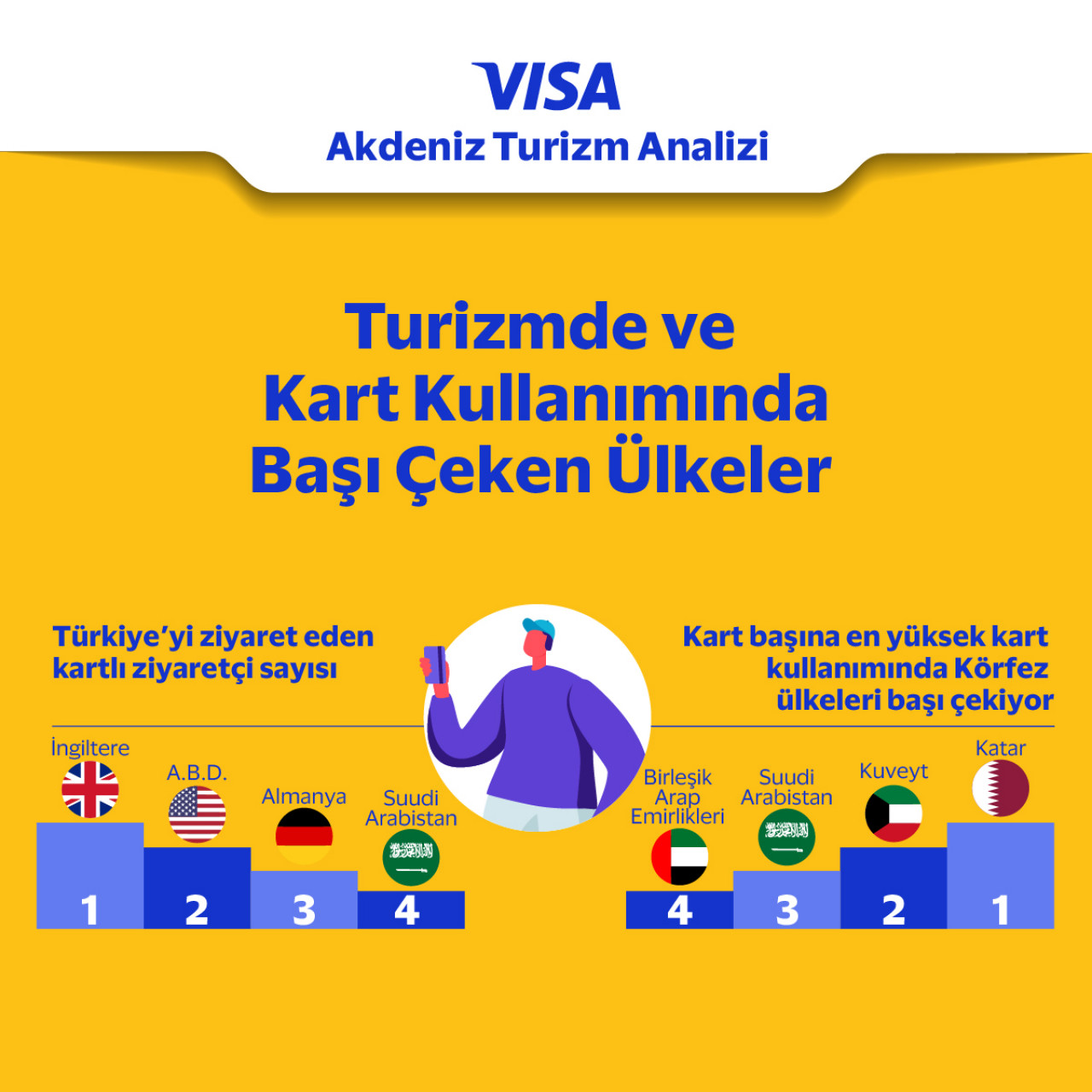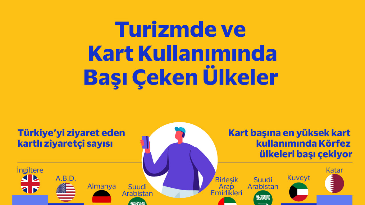 Türkiye’nin ana turizm koridorlarıAnalize göre 2023’te Türkiye’ye gelen kartlı ziyaretçi sayısında ilk dört turizm koridoru sırasıyla İngiltere, Amerika, Almanya ve Suudi Arabistan olurken kart başına kullanımlara bakıldığında sıralama Katar, Kuveyt, Suudi Arabistan ve Birleşik Arap Emirlikleri ilk dört sıraya yerleşiyor.