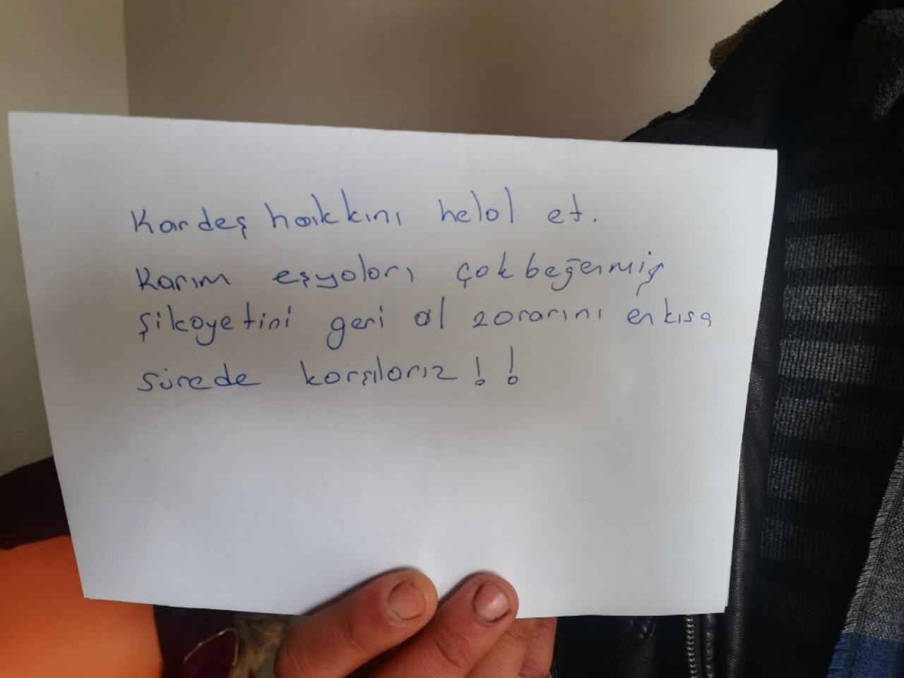 Olay, Artuklu ilçesinde bulunan bir iş merkezinin 3. katında yaşandı. Edinilen bilgilere göre, karı koca oldukları öğrenilen iki kişi, önceki akşam geç saatlerde iş merkezine gelerek 3. kata yöneldi. Buradaki iş yerini soyan zanlılar, yaklaşık 50 bin liralık malzeme ile ortadan kayboldu. İş yeri sahibi Sertaç Orman ve Veysel Anatça, ertesi gün iş yerine geldiklerine gördükleri manzara karşısında şok geçirdi. İş yerlerine hırsız girdiğini gören Orman, durumu hemen güvenlik güçlerine bildirdi. Orman, güvenlik güçleri işini yaparken kendi imkanlarıyla da hırsızları bulmaya çalıştı. Bir süre dedektif gibi iz süren Orman, iş yerine girenlerin karı koca olduğunu öğrendikten sonra kendilerine ulaştı. Zanlı aracılarla Orman'a not gönderdi. 'Kardeş hakkını helal et, şikayetini geri al, zararını en kısa sürede karşılarız. Karım eşyaları çok beğendi' notunu gören Orman, neye uğradığını şaşırdı. Orman, zanlıların bilgilerini savcılığa verdiklerini güvenlik güçlerinin de gereğini yaparak zararlarının karşılanması için mücadele ettiğini söyledi.
