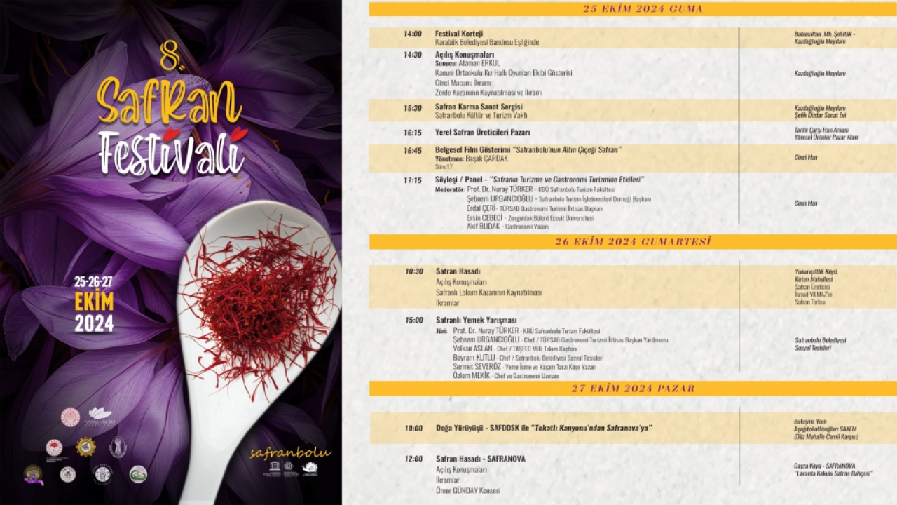 UNESCO Dünya Mirası Listesi'nde yer alan ve Cittaslow (Sakin Şehir) üyesi olan, tarihi evleriyle ünlü Safranbolu’da yetiştirilen ve "mucize bitki" olarak adlandırılan safranın hasat zamanı geldi. Her yıl Ağustos ayında ekimi yapılan, Ekim-Kasım aylarında 15-30 santimetre uzunluğa ulaşarak mor renkli ve hoş kokulu çiçekler açan, Safranbolu’ya ismini veren safran aynı zamanda boya, yemek, kozmetik, ilaç ve gıda gibi birçok sektörde kullanılıyor. Safranbolu Kaymakamlığı, Safranbolu Belediyesi, Safranbolu Kültür ve Turizm Vakfı tarafından düzenlenen aynı zamanda kentin STK, Oda ve Dernekleri tarafından desteklenen geleneksel Safran Festivali’nin 8.si 25-26-27 Ekim tarihlerinde düzenlenecek. Hazırlıkları yoğun ve uzun soluklu bir şekilde düzenlenen toplantılar sonrası Safranbolu Belediyesi Kültür ve Sosyal İşler Müdürlüğü tarafından servis edilen 8. Safran Festivali’nin program içeriği de belli oldu. 25 Ekim’de kapılarını açacak olan festivalde sergilerden safran konulu panellere, belgesel film gösterimlerinden safranlı yemek yarışmasına, doğa yürüyüşünden konserlere kadar birçok etkinlik yer aldı.