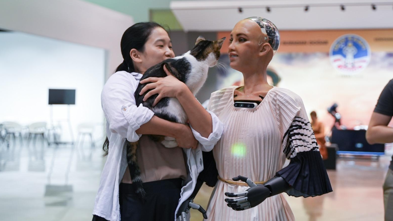 Sanat eserlerini inceleyen Sophia’yı merak eden bir sokak kedisi ile insansı robotun karşılaşması ilginç görüntüler oluşturdu. Sophia’yı Türkiye'ye getiren ekip, onun sokaktaki hayvanlarla ilk karşılaşması olduğunu dile getirdi.