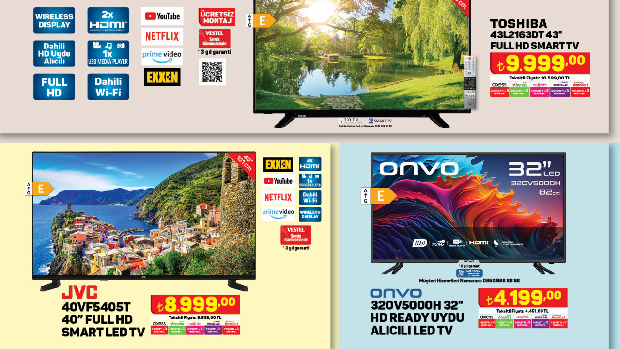 Tüketicilerin seyir zevkini katlayacak HI-LEVEL 50UL700 50” 4K Ultra HD Smart TV 10.999 TL, TOSHIBA 43L2163DT 43" Full HD Smart TV 9.999 TL, JVC 40VF5405T 40” Full HD Smart LED TV 8.999 TL ve ONVO 32OV5000H 32" HD Ready Uydu Alıcılı LED TV ise 4.199 TL’ye mağazalarda yerini alacak.