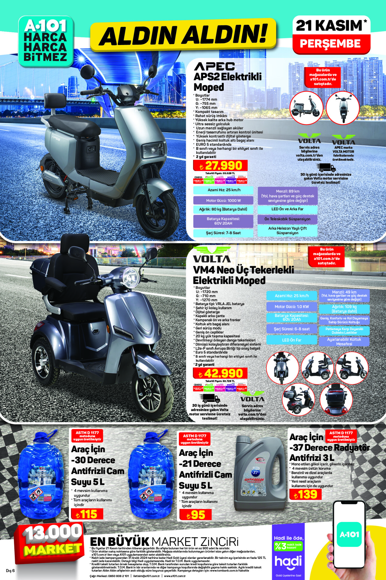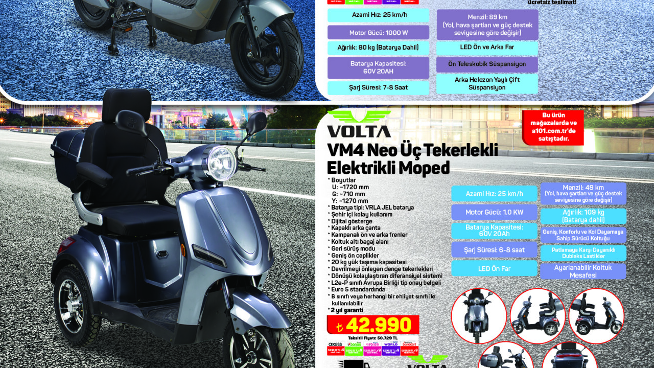 A101, 21 Kasım’da satışa sunduğu elektrikli mopedlerle sürdürülebilir ulaşımı desteklemeye devam ediyor. APEC APS2 Elektrikli Moped’i 27.990 TL’ye, VOLTA VM4 Neo Üç Tekerlekli Elektrikli Moped’i ise 42.990 TL’ye tüketicilerle buluşturuyor.