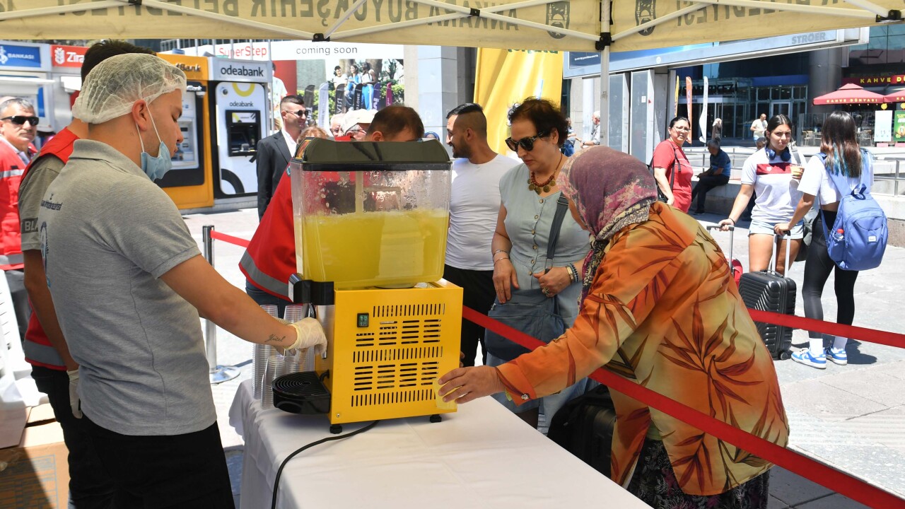 Ankara Büyükşehir Belediyesi Sosyal Hizmetler Daire Başkanlığı tarafından vatandaşların serinlemesi ve sıvı ihtiyaçlarının karşılanmasına katkı sağlamak amacıyla ücretsiz soğuk organik limonata ikramına başlandı.