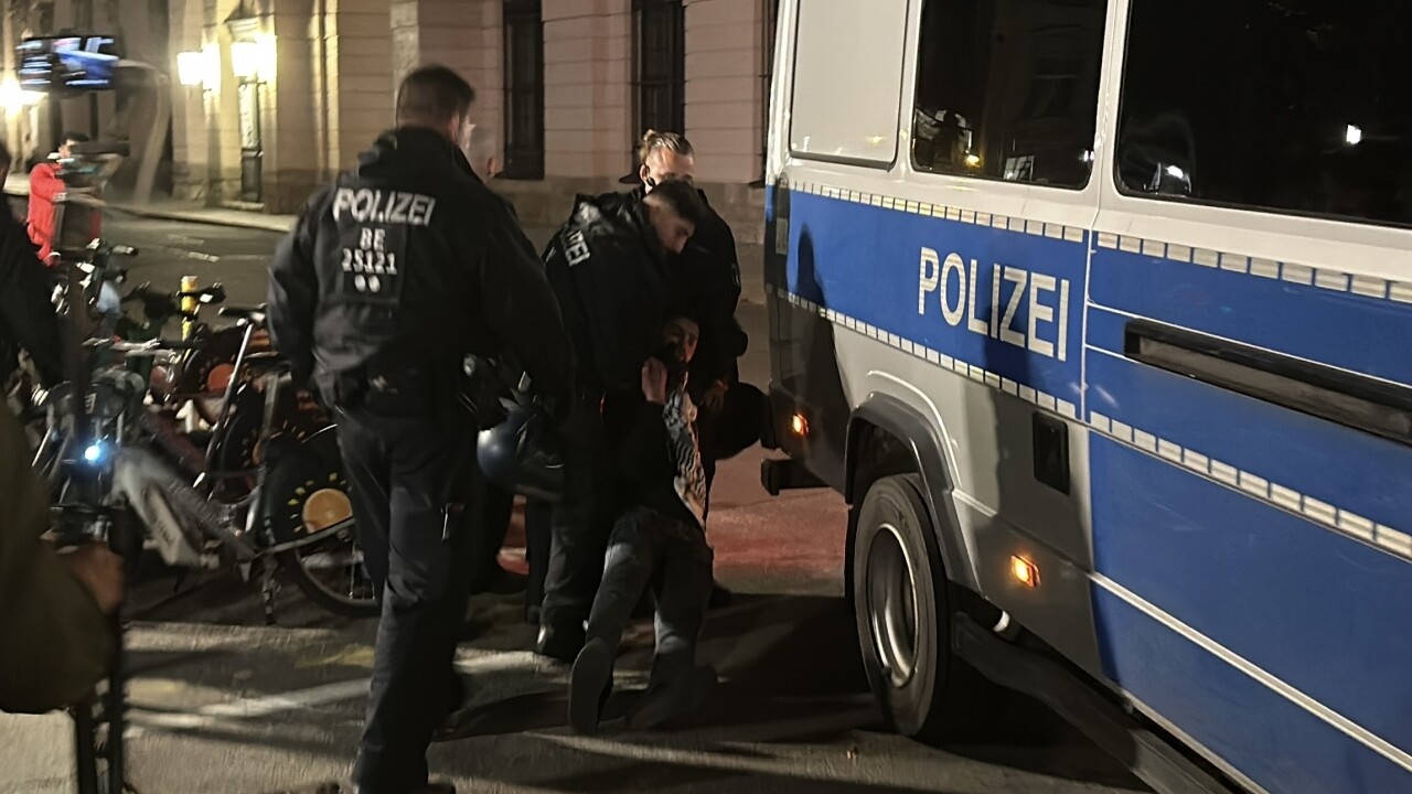 Alexander Meydanı'nda toplanan göstericiler, daha sonra Filistin bayraklarıyla Unter den Linden metro istasyonuna kadar yürüdü.