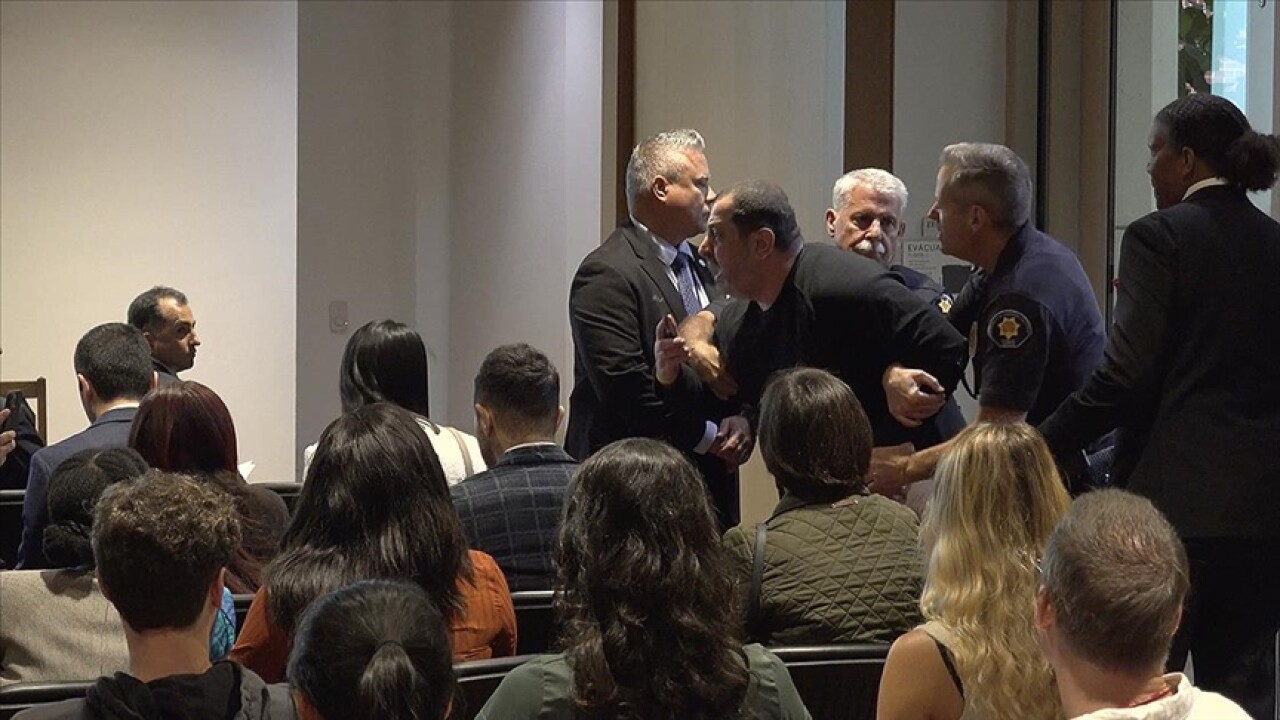 Etkinliğin açılış konuşmalarının ardından, Türkiye'nin Washington Büyükelçisi Mercan'ın konuşmasını yapmak üzere kürsüye çıkmasıyla 11 kişilik bir öğrenci grubu protestoya başladı.