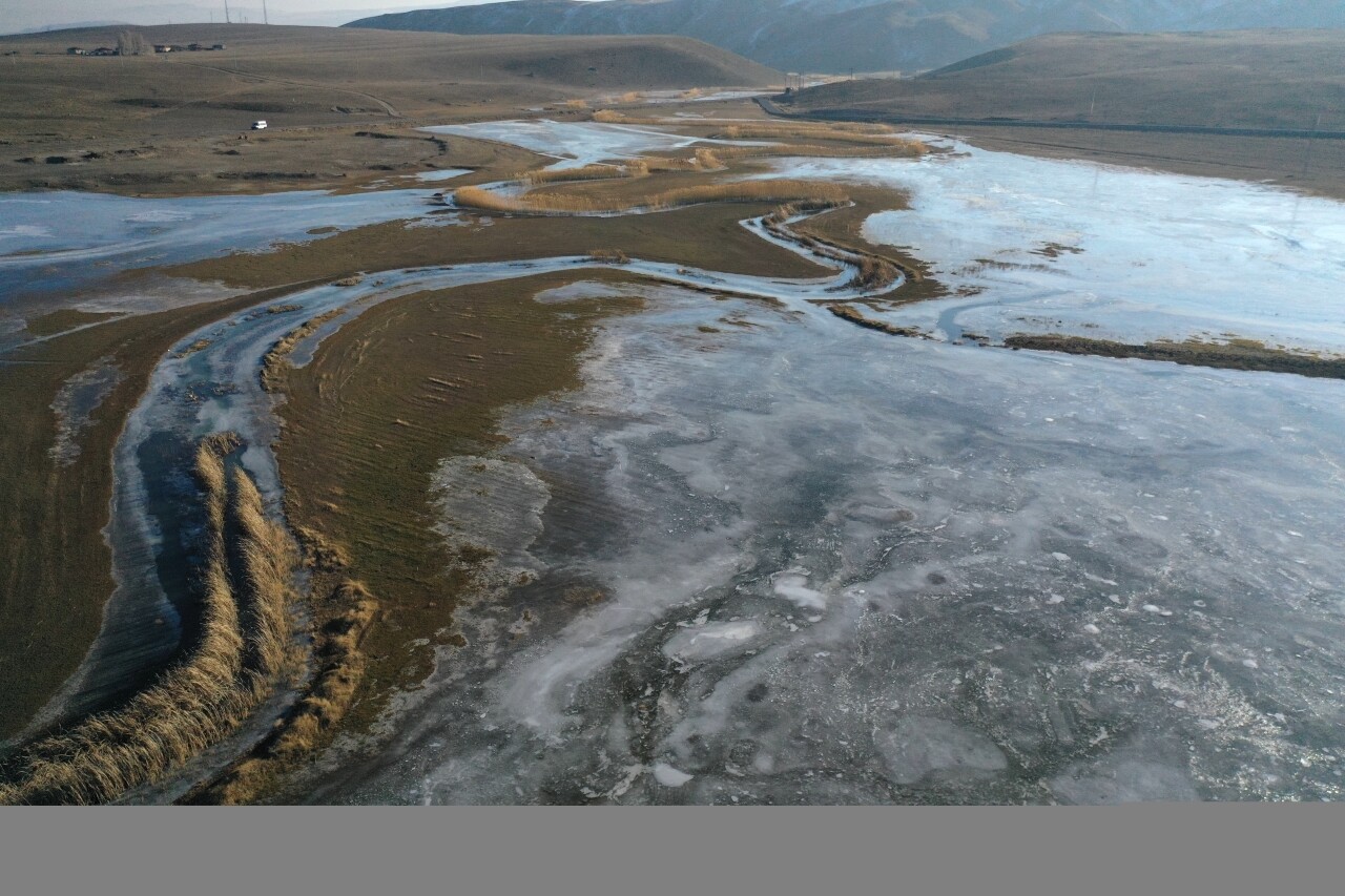 Soğuk havanın etkisiyle Doğubayazıt ilçesine bağlı Dalbahçe, Suluçem ve çevredeki düzlük köylerde geniş alana yayılan sulak alanlar dondu.