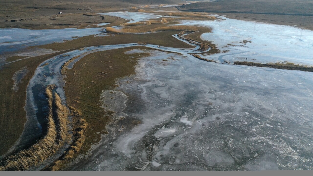 Yüzeyi buzla kaplanan alanlar dronla görüntülendi.