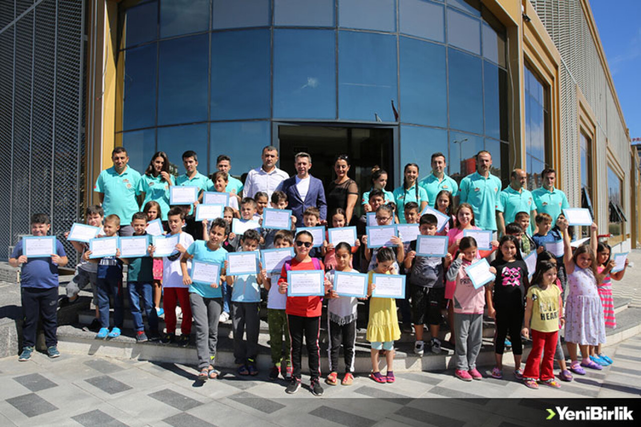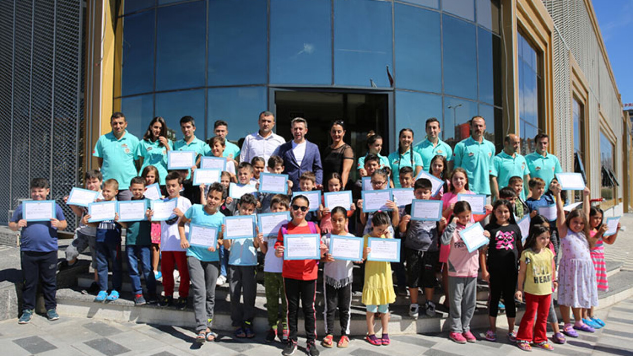 Merkezde açılan yüzme kursuna katılan 135 çocuk yüzme sertifikası aldı. Tesisin yarı olimpik kapalı yüzme havuzundaki yüzme hocaları eşliğinde 4 haftalık eğitimi başarıyla tamamlayan çocuklar büyük heyecan yaşadılar. Aileleri de bu mutlu günlerinde çocuklarını yalnız bırakmadı. Çocuklar hocaları eşliğinde yüzme öğrenirken aileler de kafeteryadaki ekrandan canlı olarak onları izledi. Son yüzme seansının ardından çocuklara sertifikaları dağıtıldı.