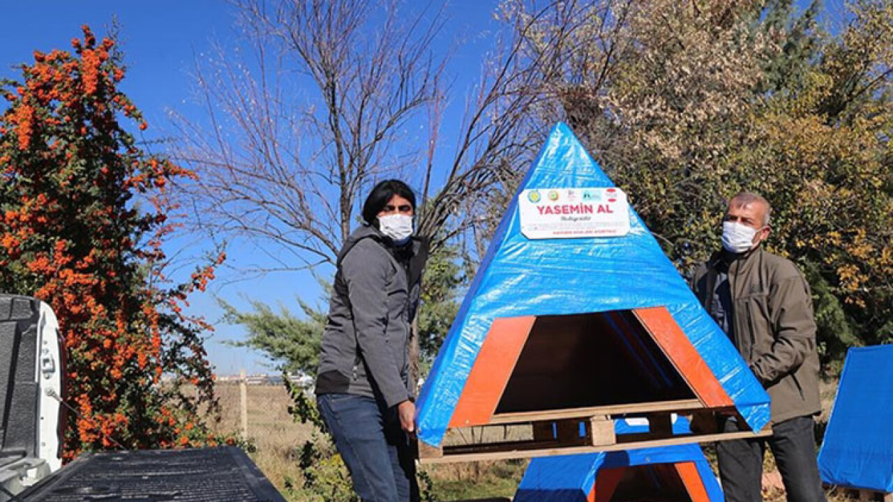 Şanlıurfa'da çeşitli meslek gruplarından hayvanseverler, esnaftan topladıkları ahşap palet ve meyve kasalarını sokak hayvanları için yuvaya dönüştürüyor.