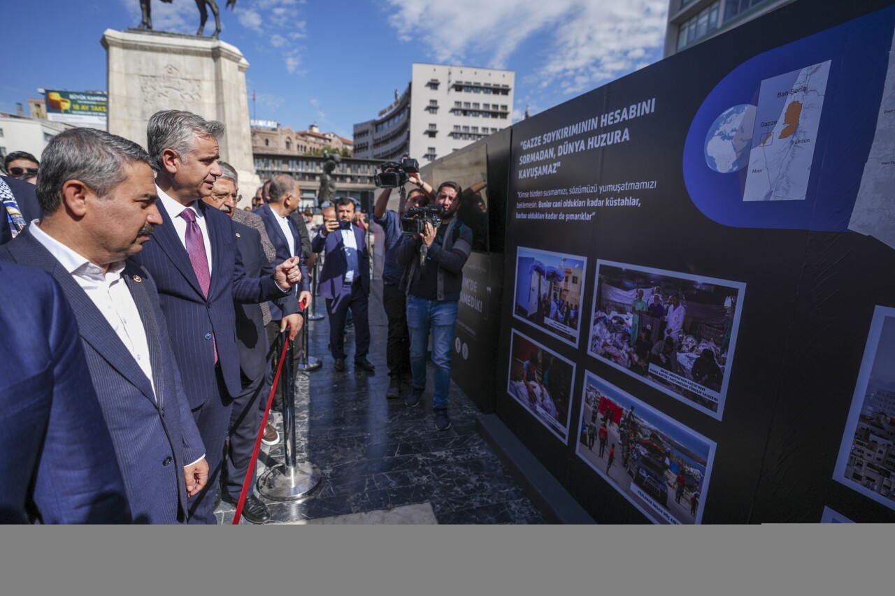 Ulus Atatürk Heykeli önünde kurulan sergide, İsrail'in Filistin ve Filistinlilere yönelik saldırılarının geçmişi, Türkiye'nin Filistin konusunda yaptıkları, Cumhurbaşkanı Recep Tayyip Erdoğan'ın Filistin konusundaki sözleri panolarda yer aldı.