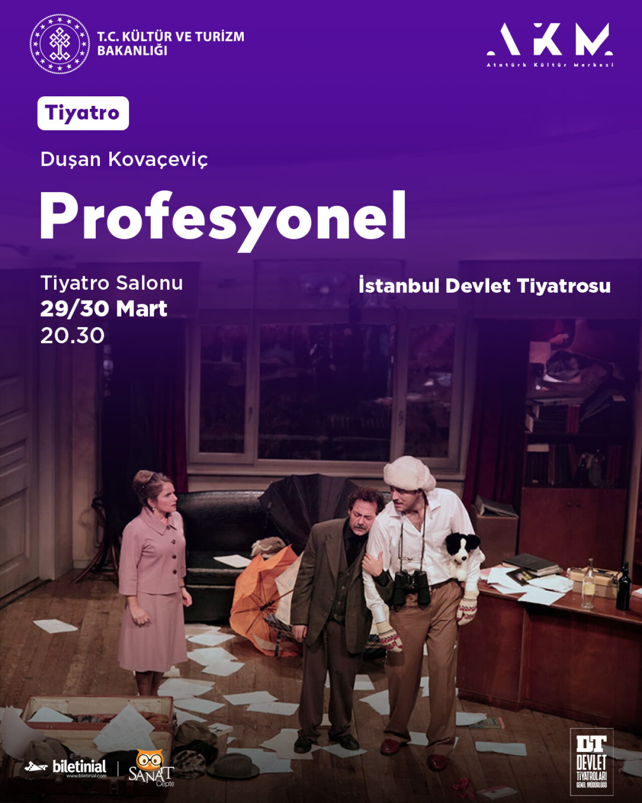 Dünyaca ünlü Sırp yazar Duşan Kovaçevic’in ‘Profesyonel’ isimli kara komedisi, 29-30 Mart tarihlerinde AKM Tiyatro Salonunda sanatseverle buluşacak. Yugoslavya’daki büyük dönüşümden önceki ve sonraki toplumsal-politik ortamı, bir entelektüelin yaşam öyküsü içinde ironik bir üslupla anlatan oyun; 40 yaşlarında bir edebiyat adamı, bir sekreter ve bir gizli polisin sürprizlerle dolu soluk soluğa izlenecek hikayesini konu alıyor. ‘Profesyonel’ oyunu ünlü oyuncular; Bülent Emin Yarar, Yetkin Dikinciler, Gülen Çehreli ve Cenap Oğuz tarafından sahneye taşınacak.