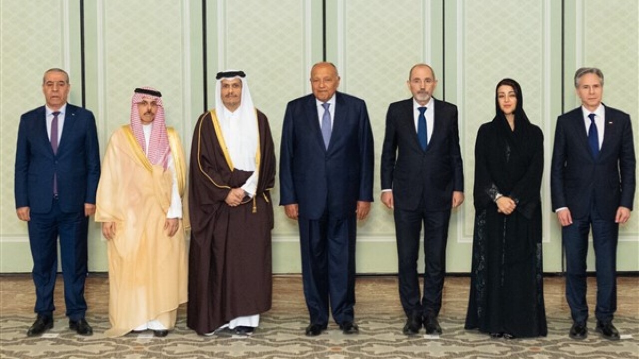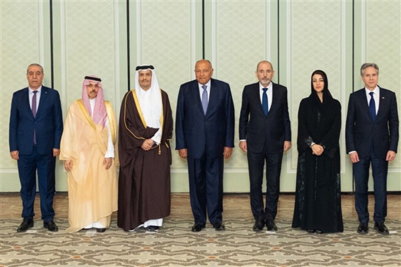 Katar Başbakanı ve Dışişleri Bakanı Şeyh Muhammed bin Abdurrahman Al Sani, Katar Devleti, Mısır Arap Cumhuriyeti, Birleşik Arap Emirlikleri, Ürdün Haşimi Krallığı ve Filistin Devleti'nin Dışişleri Bakanlarının Amerika Birleşik Devletleri (ABD) Dışişleri Bakanı Antony Blinken ile bir araya geldiği bir toplantıya katıldı.
