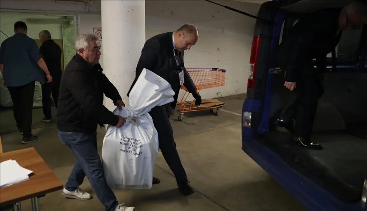 Oy pusulalarının bulunduğu torbalar, söz konusu bölgelerdeki saklama ve ulaştırma komisyonu üyeleri tarafından Türkiye’den gelen oy torbaları nakil komisyonuna teslim edildikten sonra kargo konteynerlere konuldu.