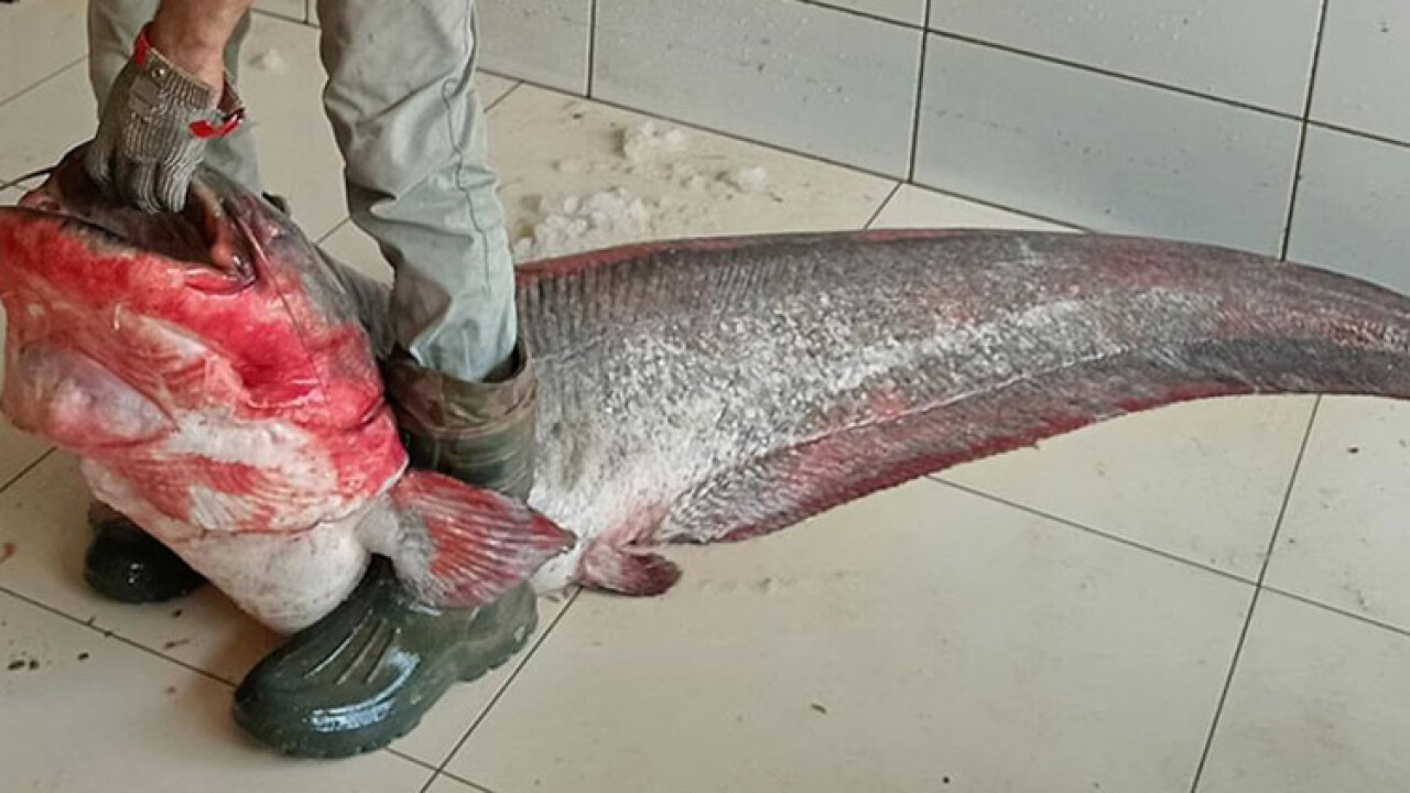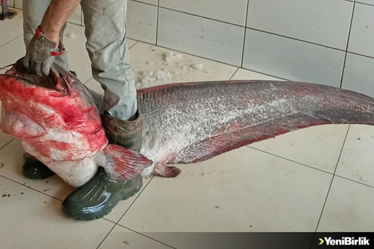 İki balıkçı, yaklaşık 2 metre uzunluğunda ve 70 kilogram ağırlığındaki balığı güçlükle sudan çekebildi.