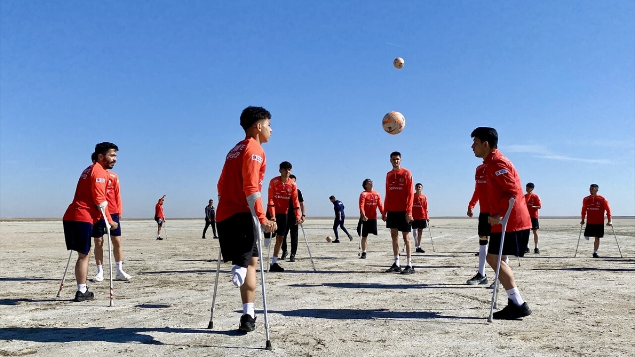 Arnavutluk'taki Balkan Şampiyonası'na Kırşehir'de hazırlanan Ampute Milli Futbol Takımı oyuncuları, kuraklığa dikkat çekmek için Seyfe Gölü'nün kuruyan yüzeyinde antrenman yaptı.