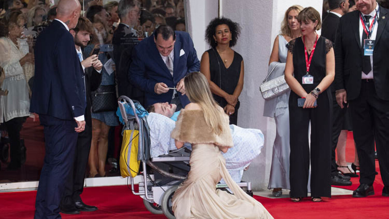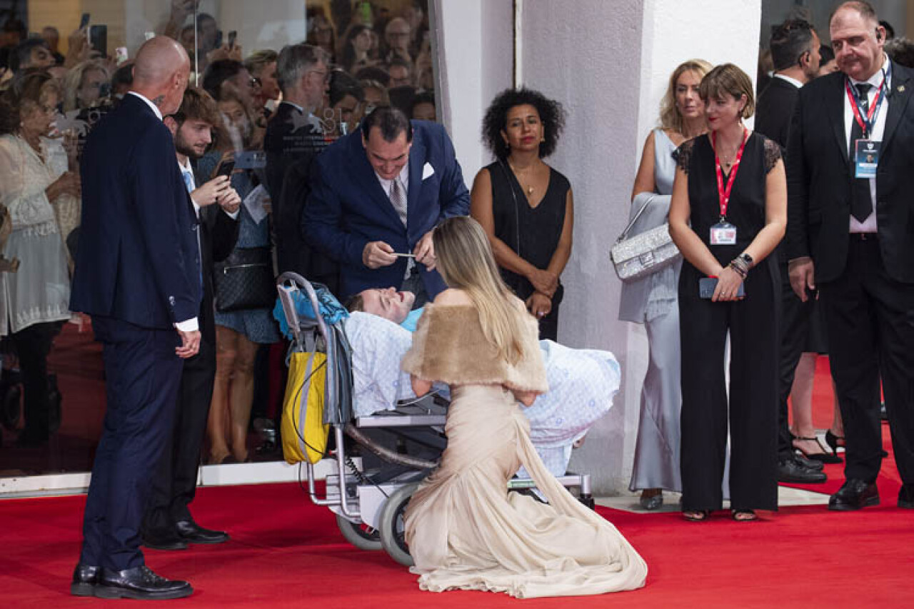 Venedik Film Festivali'nin kırmızı halı seremonisinde Angelina Jolie, kırılgan kemik hastalığından muzdarip hayranı olan İtalyan yazar Pasqualino Esposito ile tanışmak için dizlerinin üstüne çöktü.
