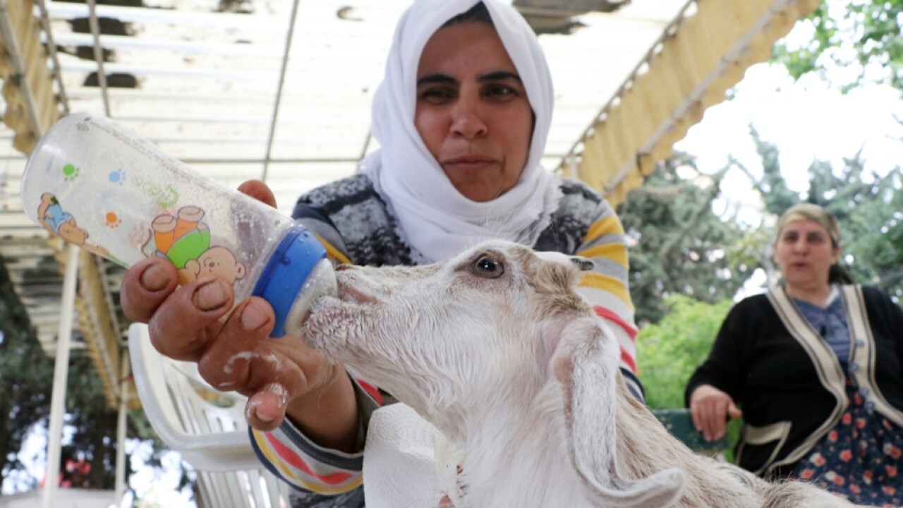 Mersin'de iki kız kardeş, annesi ölen yavru keçiyi evlatları gibi sahiplendi.