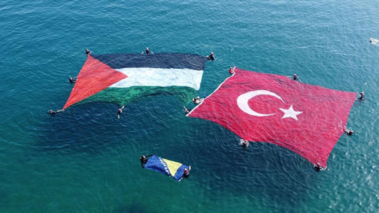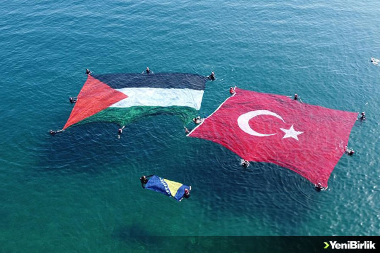 Sahilde dalgıç kıyafetleri giyen arama kurtarma ekipleri, dev Türk ve Filistin bayrakları ile denize girdi. Yaklaşık 25 kişilik ekibin katıldığı eylemde bayraklar deniz yüzeyinde açıldı, plajda güneşlenen tatilciler de bayrakların açılmasına alkışlarla destek oldu. O anlar cep telefonu kameralarıyla kayıt altına alındı.