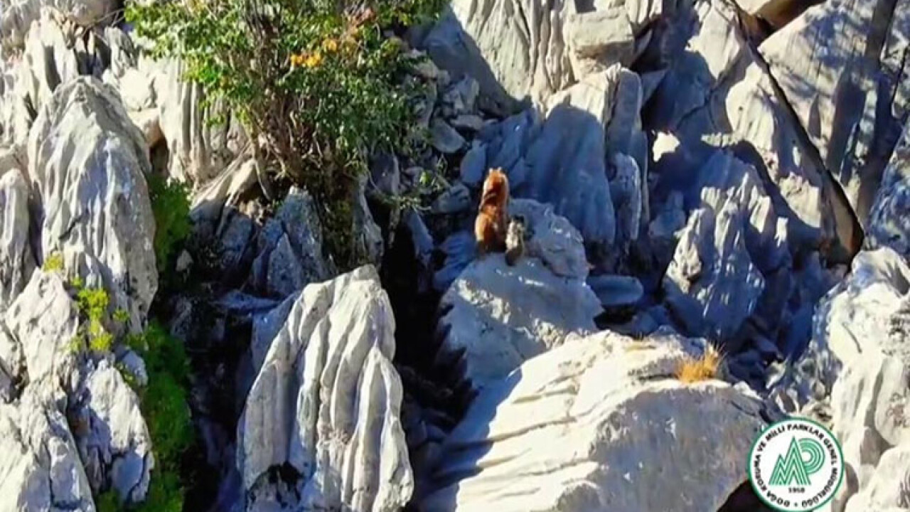 Görüntülerde, anne ve ikiz yavrusunun sarp kayalıklara arasında gezinmesi ve tırmanma çabaları yer aldı.