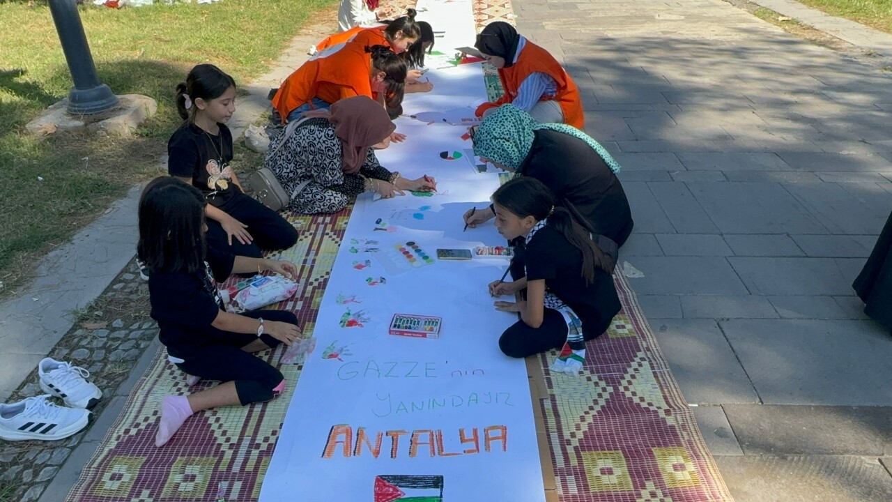Yetim Vakfı öncülüğünde, Karaalioğlu Parkı'nda gerçekleştirilen programda, katılımcılar İsrail'i protesto etti, yere serilen büyük kağıtlara pastel ve sulu boyalarla resim yaptı.
