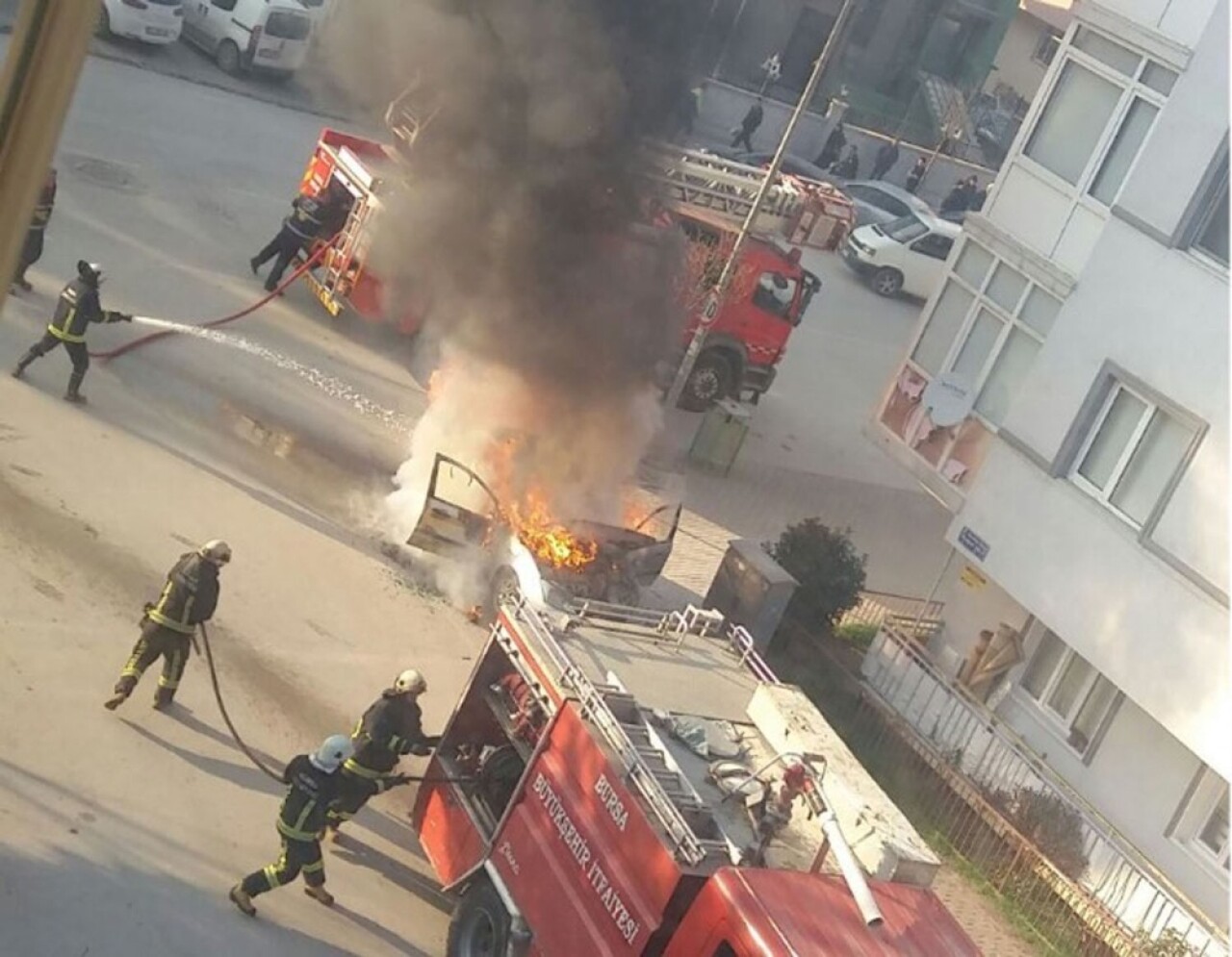 Edinilen bilgiye göre, 16 F 5335 plakalı aracını Park Caddesi ile Doğal Sokağı’nın kesiştiği kavşağa park eden Hasan Korkmaz, işini halletmek için İnegöl Vergi Dairesi’ne gitti. Park halindeki araç henüz bilinmeyen bir sebepten dolayı alev aldı. Aracın yandığını gören çevre sakinleri durumu itfaiyeye haber verdi. İtfaiye ekipleri, zaman zaman patlamaların da yaşandığı yangına müdahale ederek aracı söndürdü. Bir apartmanın ikinci katının balkonu da zarar görürken, otomobil kullanılamaz hale geldi.