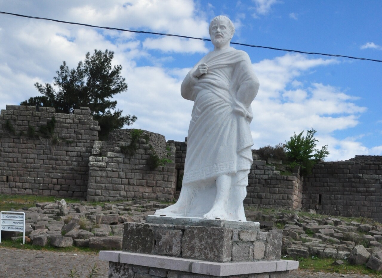 Behramkale olarak anılan ve antik dönemde önemli bir liman kenti olan Assos girişine 2009 yılında Kültür ve Turizm Bakanlığı’nca ilk felsefe okulunun kurucusu Aristoteles’in heykeli dikildi. Assos’ta yaklaşık 2 bin 400 yıl önce yaşayan ve antik kentte açtığı felsefe okulunda dersler veren Aristo’nın antik kent girişinde turistleri karşılayan heykeli, kimliği belirsiz kişi ya da kişilerce tahrip edilmiş, heykelin sağ kolu kırılmış ve yüz kısmında da önemli tahribat oluşmuştu. Onarılması için Behramkale Muhtarlığı tarafından İzmir’e gönderilen Aristo heykeli yenilerek kaidesine konuldu.
