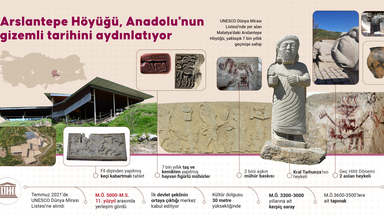 Yerleşik hayata geçiş ve tarımsal üretimin başladığı dönemlere tanıklık eden Arslantepe, özellikle Erken Tunç Çağı'nda güçlü bir siyasi ve sosyal merkez olma özelliği taşıyor. Bölge Hatti, Hurri ve ardından Hitit medeniyetleri tarafından kullanılırken, yapılan araştırmalar Arslantepe'nin yalnızca bir yerleşim yeri değil, aynı zamanda dini ve kültürel ritüellerin de gerçekleştirildiği bir merkez olduğunu ortaya çıkardı. Arslantepe Höyüğü Birleşmiş Milletler Eğitim, Bilim ve Kültür Örgütü (UNESCO) tarafından 2021'de Dünya Miras Listesi'ne alındı. Bu tarihten itibaren uluslararası alanda tanınırlığı artan ve daha fazla ilgi görmeye başlayan höyükteki çalışmalar, bölgenin geçmişteki sırlarını gün yüzüne çıkarmaya evam ediyor. Anadolu'nun kadim medeniyetlerine dair eşsiz bilgiler sunan Arslantepe, yapılan kazı çalışmalarının yanı sıra ziyaretçilerini de ağırlıyor.