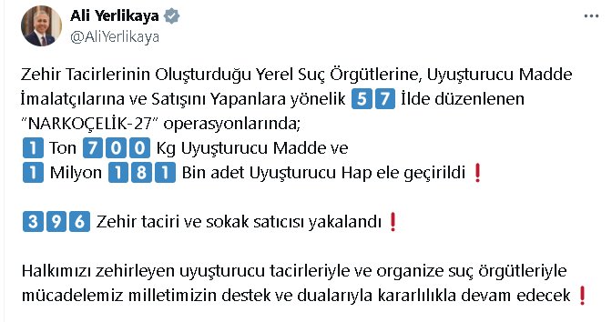Bakan Yerlikaya, sosyal medya hesabından yaptığı açıklamada, Emniyet Genel Müdürlüğü Narkotik Suçlarla Mücadele Başkanlığı koordinesinde 57 ilde "Narkoçelik-27" operasyonları düzenlendiğini belirtti. Buna göre; 990 ekip ve 2 bin 475 personelin görev yaptığı operasyonlarda 8 hava aracı ve 34 narkotik dedektör köpeği kullanıldı. Yapılan ev ve iş yeri baskınları ile yol kontrolleri sonucu 1 ton 700 kilogram uyuşturucu madde, 1 milyon 181 bin uyuşturucu hap ele geçirildi, 396 şüpheli yakalandı.