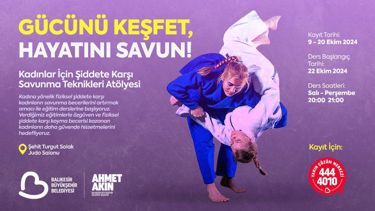 Balıkesir Büyükşehir Belediyesi Gençlik ve Spor Dairesi Başkanlığı tarafından hayata geçirilen Savunma Teknikleri Atölyesi başvuruları 9 Ekim itibariyle başladı. Kadınların kendilerini daha güvende hissetmesi, fiziksel şiddete karşı kendini koruyabilmesi için judo eğitimi verilecek olan atölyede eğitimleri uzman kadın antrenörler verecek. Kursun son kayıt tarihi ise 20 Ekim olarak belirlendi.