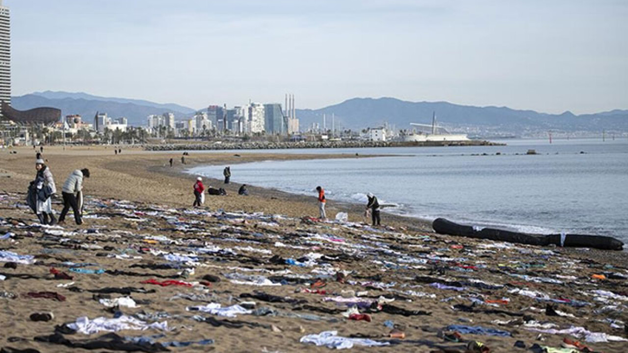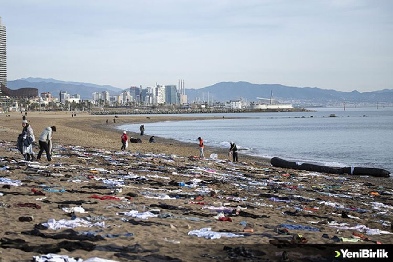 Barselona kent merkezindeki Barceloneta plajında sabah erken saatlerde yüzlerce giysiyi kuma seren Open Arms yetkilileri, Avrupa'ya göç etmek için hayatlarını kaybeden 2 bin 600'den fazla düzensiz göçmene dikkati çekti.