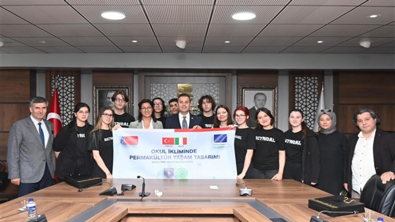 Okul Müdürü Konakbay ve öğrenciler, Başkan Akın’a Erasmus+ İtalya iş birliği ile geliştirdikleri "Okul İkliminde Permakültür Yaşam Tasarımı" projelerinin tanıtımını yaparak yerel paydaşlarla ortak girişim oluşturmak üzere bilgi verdi.