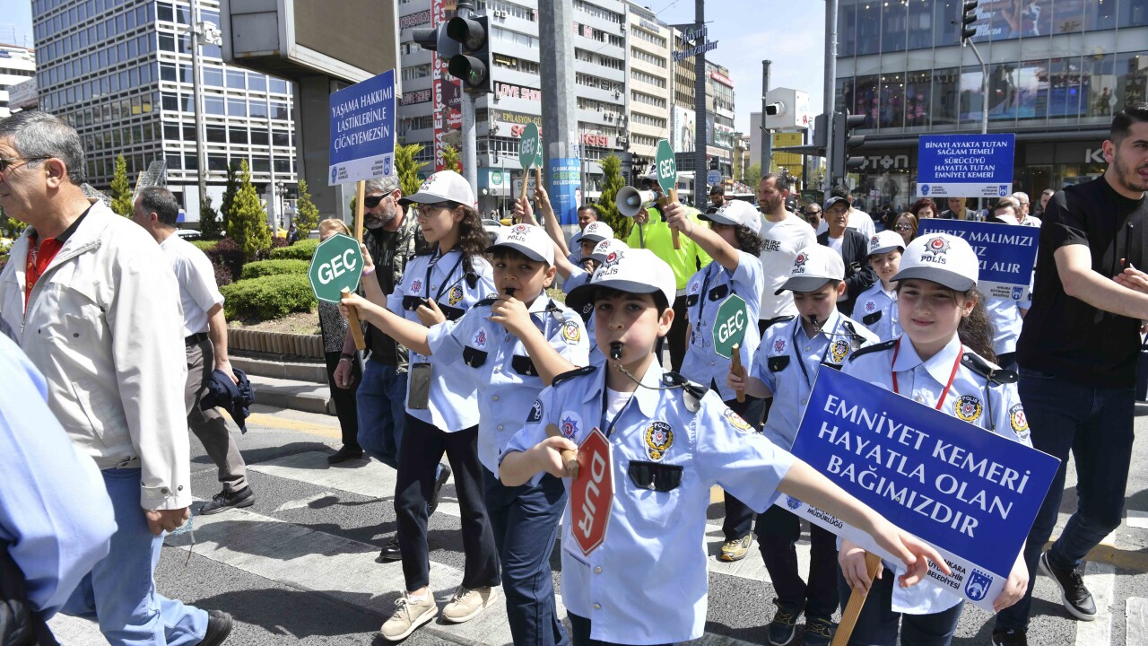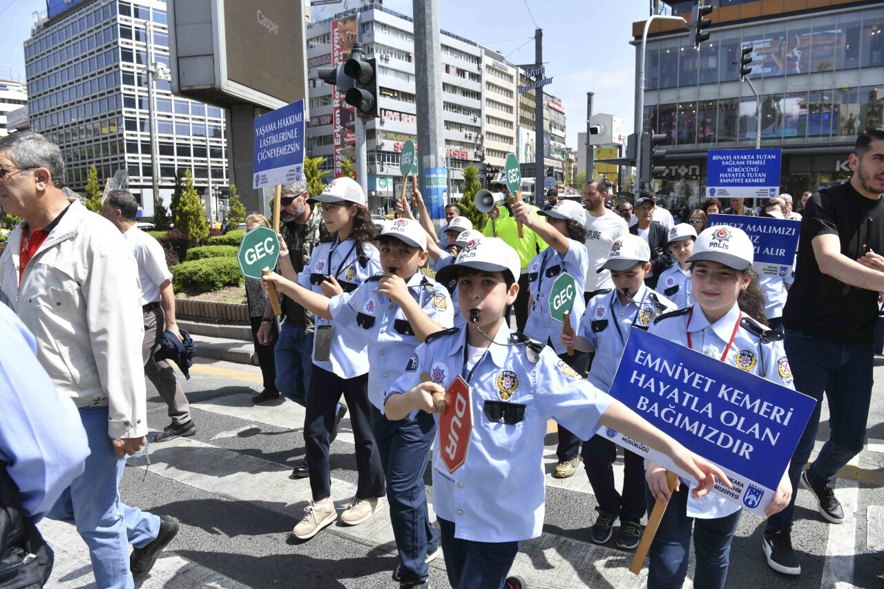 Üniforma ve şapkalarıyla Kızılay’da uygulamalı denetim yapan küçük polisler, “Trafik kültürü, kanunlarla değil saygıyla gelişir”, “Emniyet kemeri hayatla olan bağımızdır”, "Hırsız malımızı, hız canımızı alır” ve “Yaşama hakkımı lastiklerinle çiğneyemezsin” gibi sloganlarla vatandaşlara önemli mesajlar verdi.