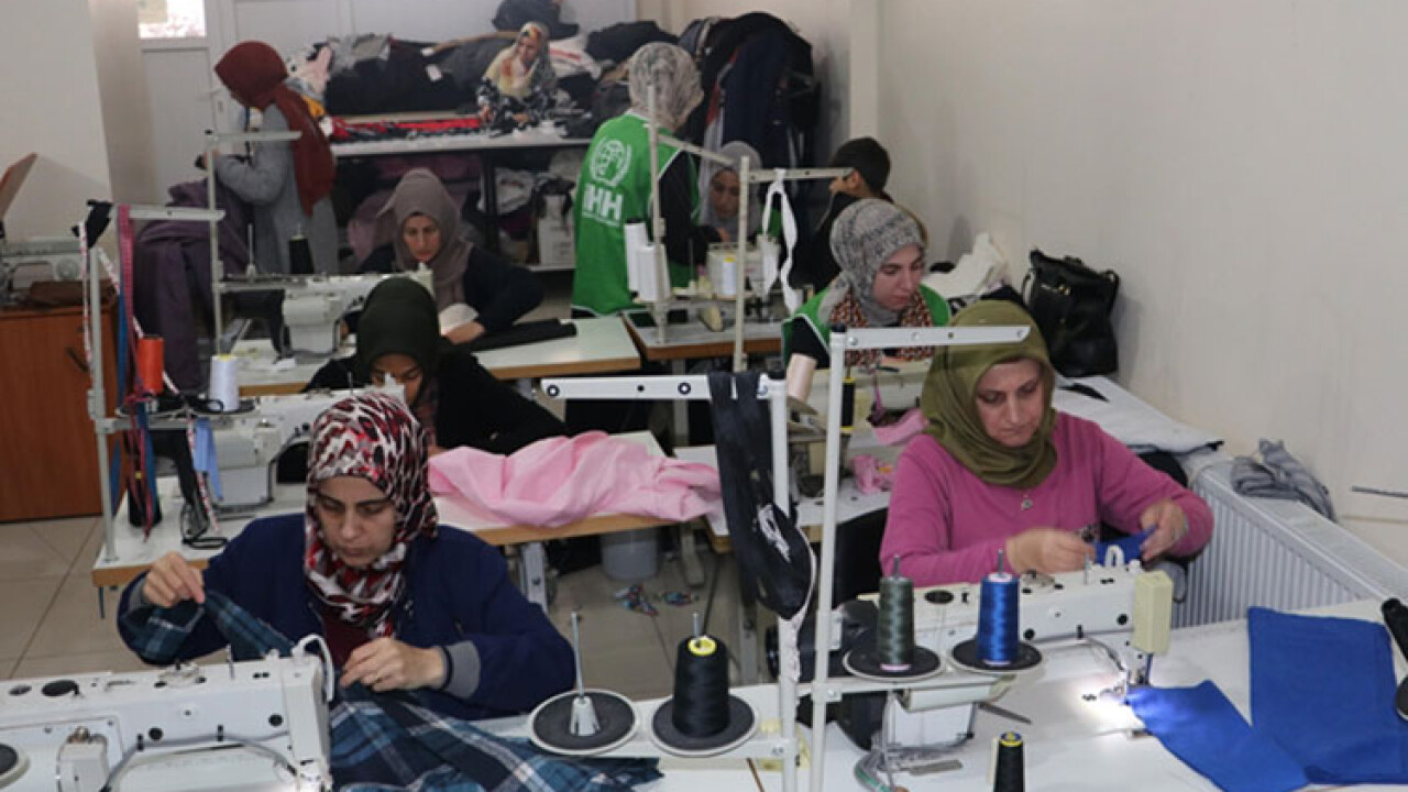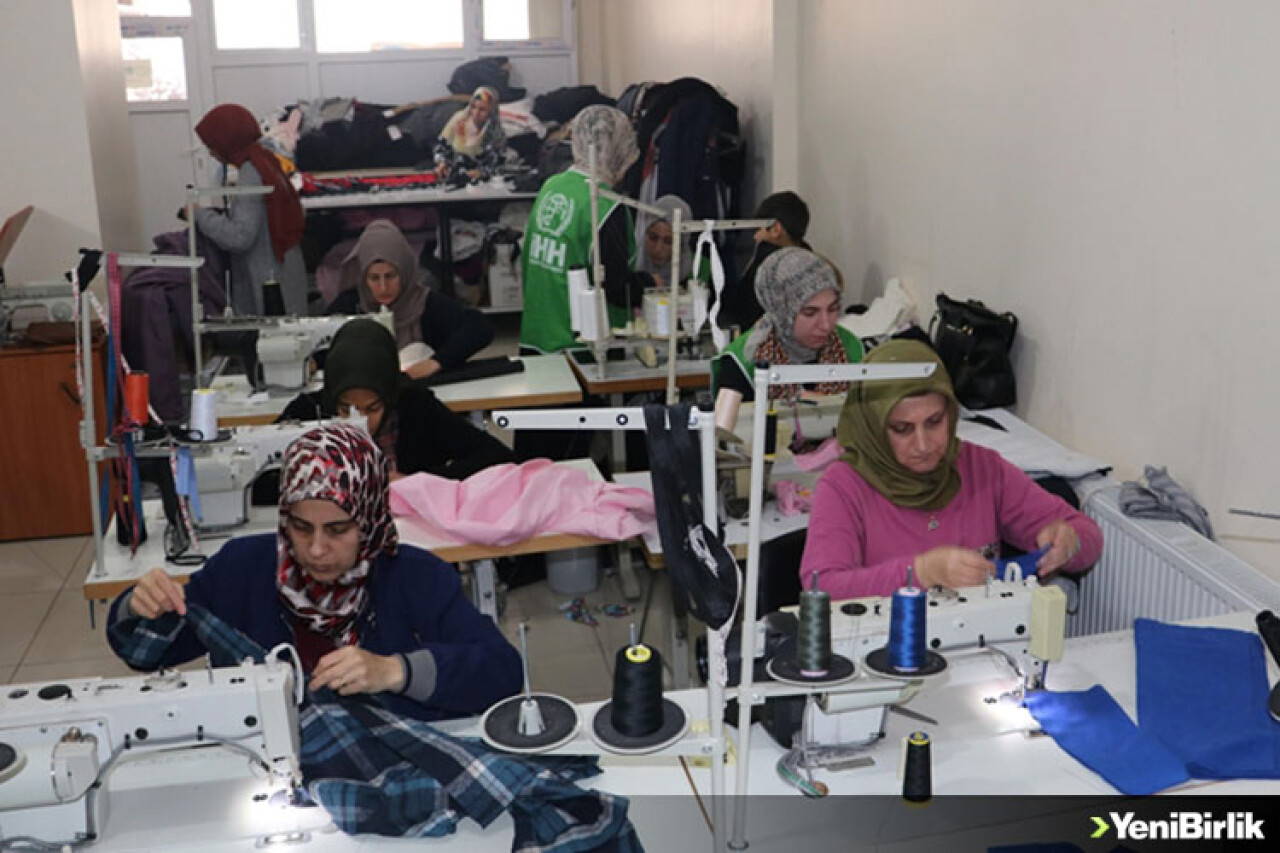 Batman'da İHH İnsani Yardım Derneğinin giyim atölyesinde bir araya gelen gönüllü kadınlar depremzedeler için mont, pijama takımı, tayt ve tişört gibi ürünler dikiyor.