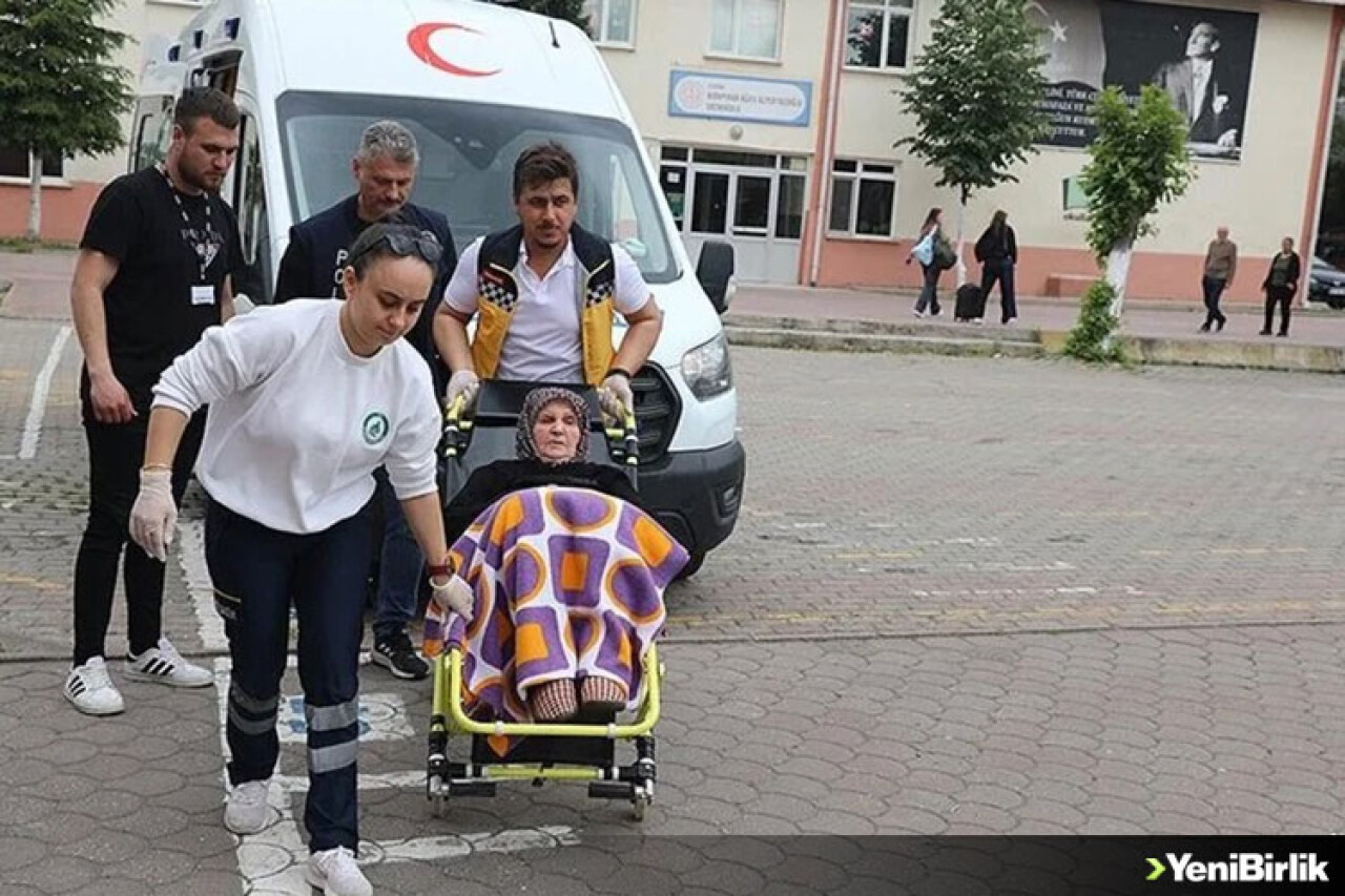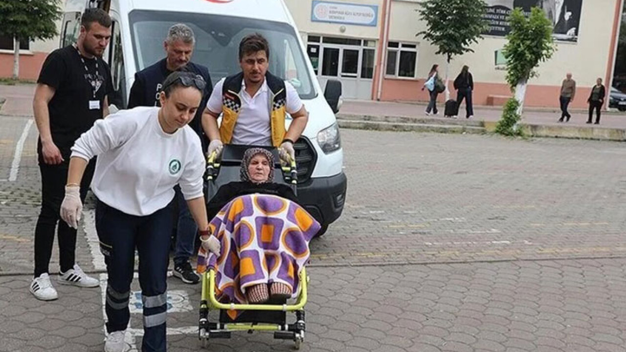 Ambulansla oy kullanacağı Kırkşehitler İlkokulu'na götürülen Kaya, sağlık personeli tarafından sandığının bulunduğu kata sedyeyle çıkarıldı.