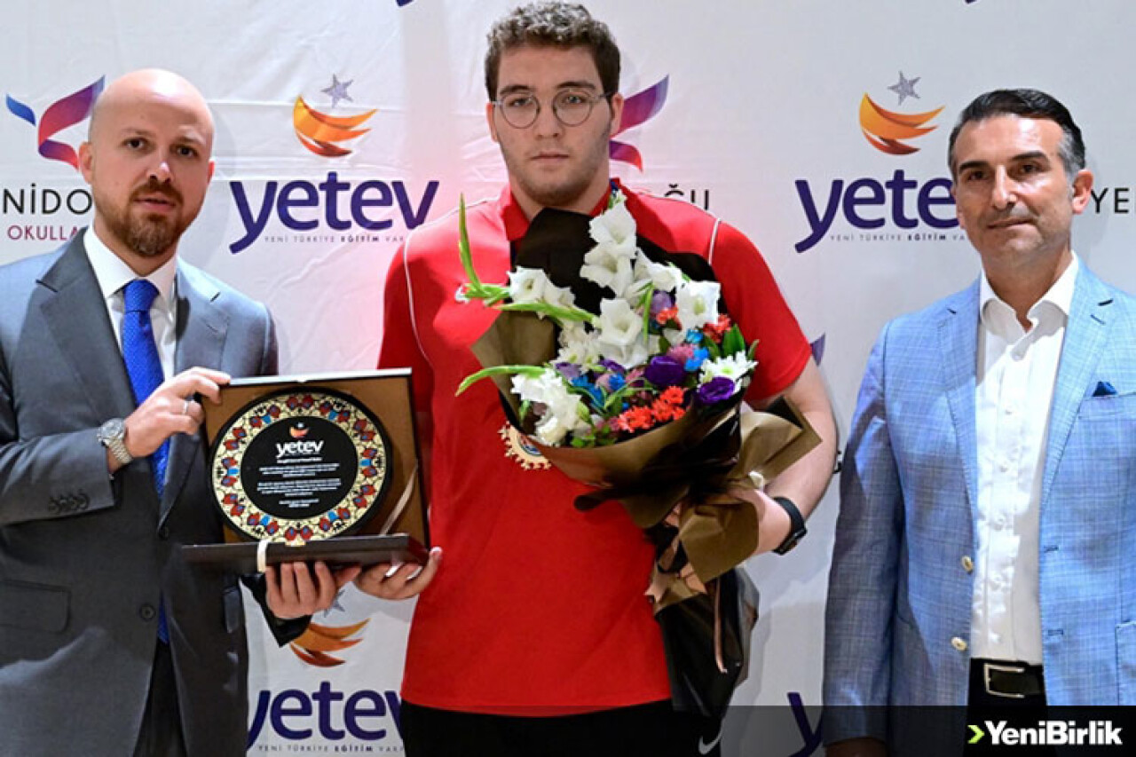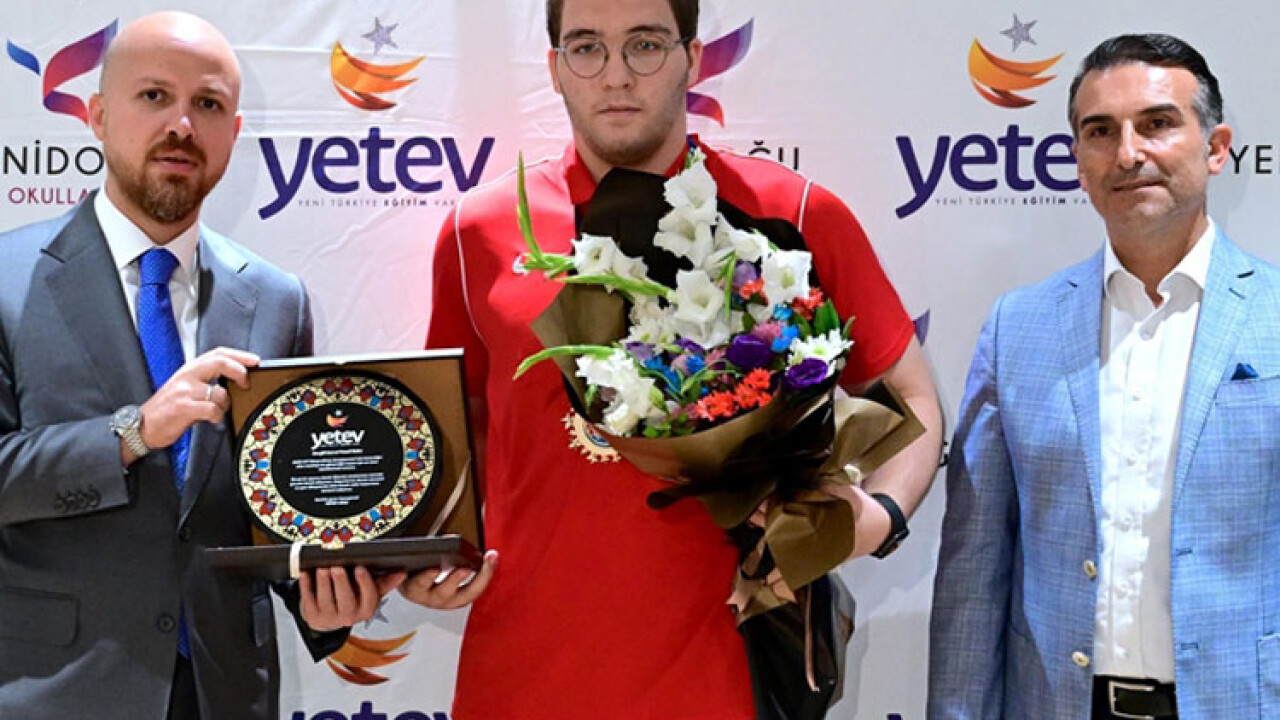 YETEV çatısı altındaki Yenidoğu Okulları öğrencisi olan Cemal Yusuf Bakır'a plaket ve hediye veren Erdoğan, yaptığı konuşmada, YETEV Okulları bünyesinde Gençlik ve Spor Bakanlığıyla yapılan anlaşmayla başarılı sporcuları eğitim dönemlerinde desteklediklerini vurguladı.