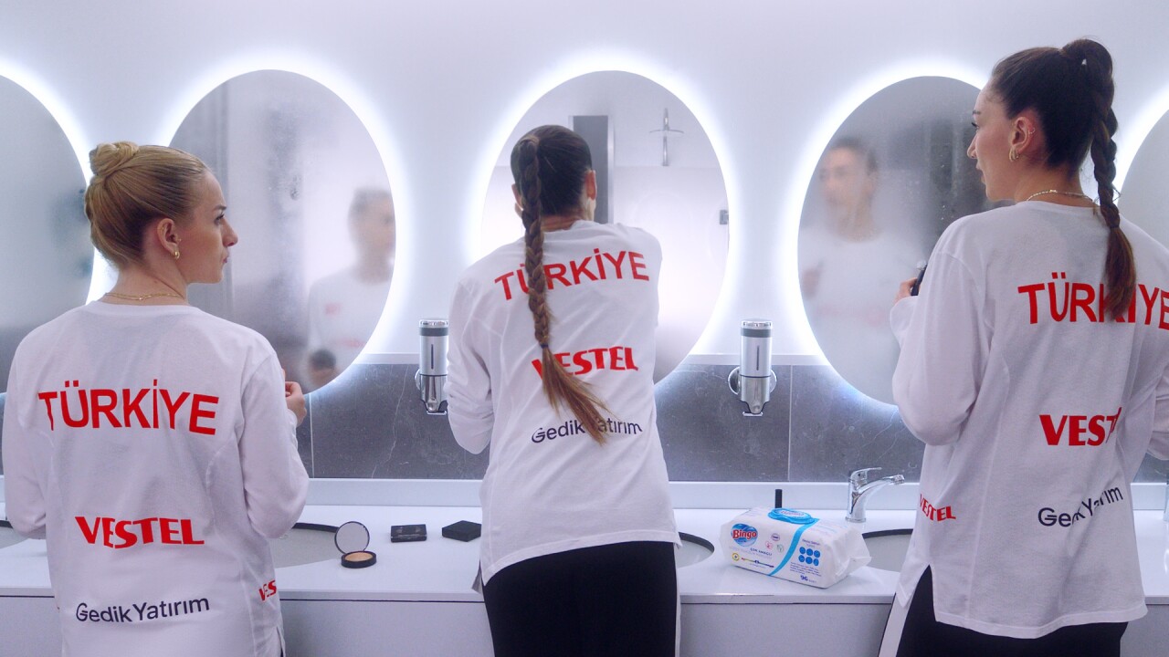 Milli sporcular bir yandan hazırlanıp bir yandan da konuşurken kamera ise duşlardan gelen buharla kaplanan aynalara odaklanıyor. Tam bu anda milli sporcular arasında sadece Eda Erdem Dündar’ın aynasının buğulanmadığı fark ediliyor, milli sporcunun sırrının Bingo Yüzey Temizlik Havlusu olduğu ortaya çıkıyor.