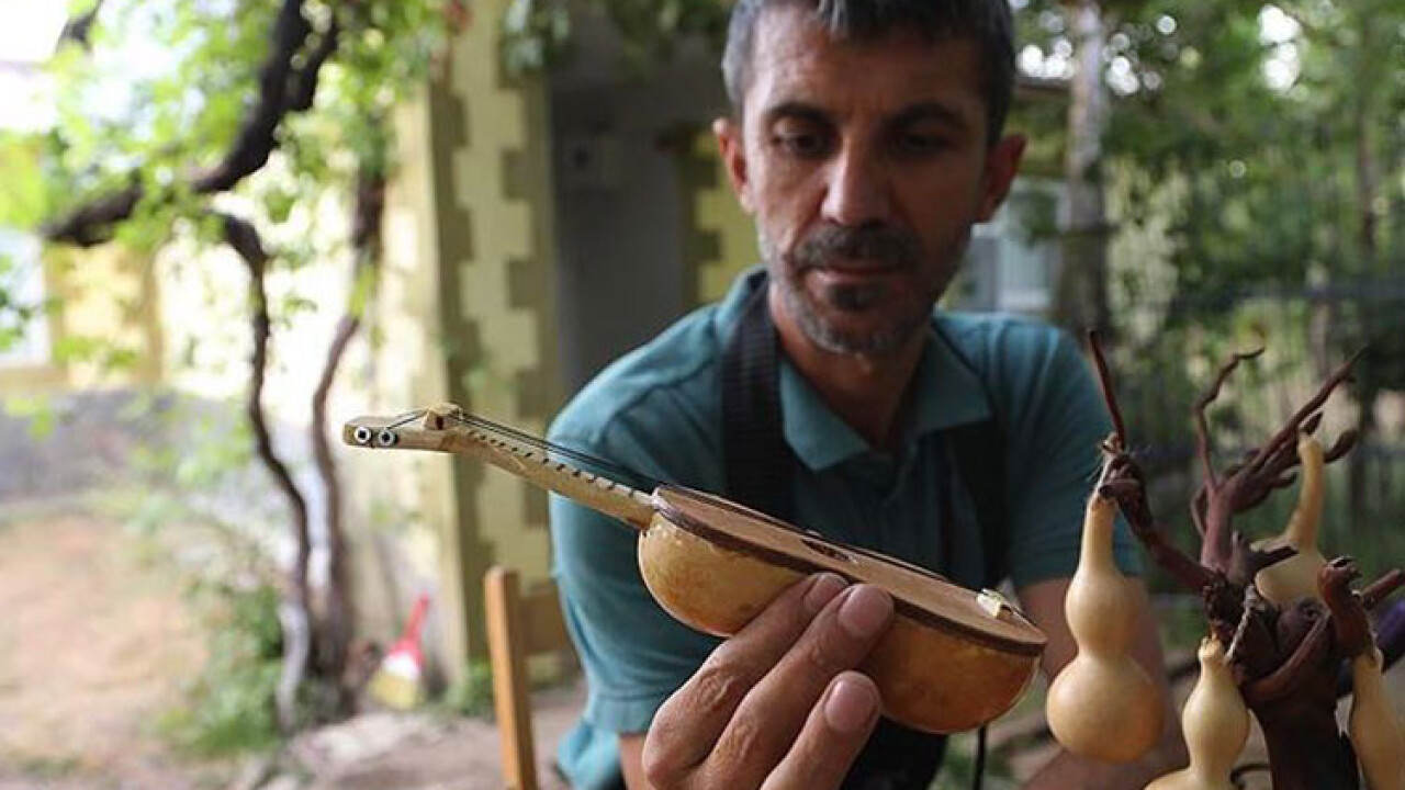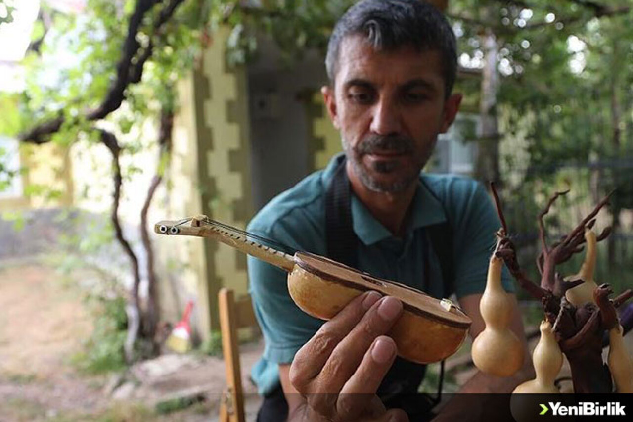 Bingöllü el sanatları ustası Kaya, doğadan topladığı kuru odunları, taşları ve yetiştirdiği su kabaklarını işleyerek sanat eserine dönüştürüyor.