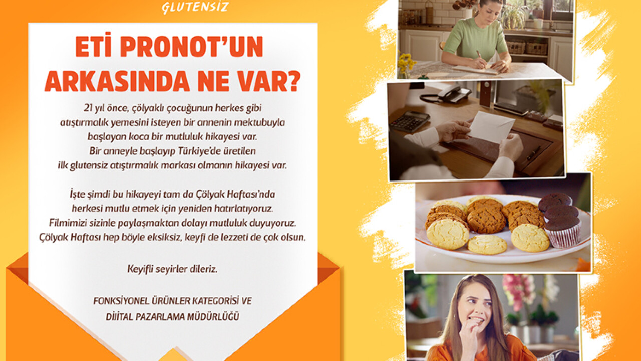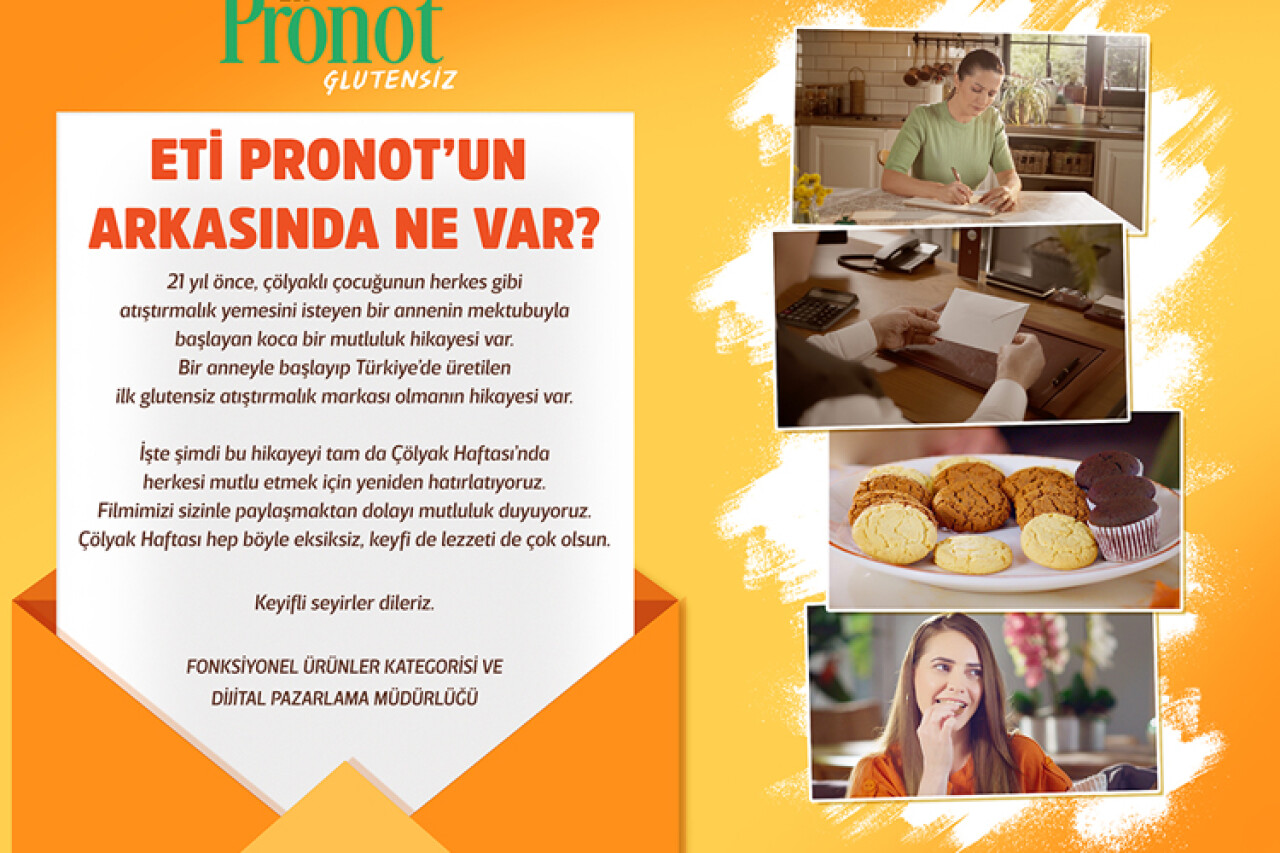 “ETi Pronot’un arkasında ne var?” sorusuyla açılan reklam filmi, markanın yola çıkış hikâyesine ışık tutuyor. 21 yıl önce çölyaklı çocuğunun herkes gibi atıştırmalık yemesini arzulayan bir annenin ETi’ye yazdığı bir mektupla başlayan bu hikâye, izleyiciye sıcak bir dille aktarılıyor.