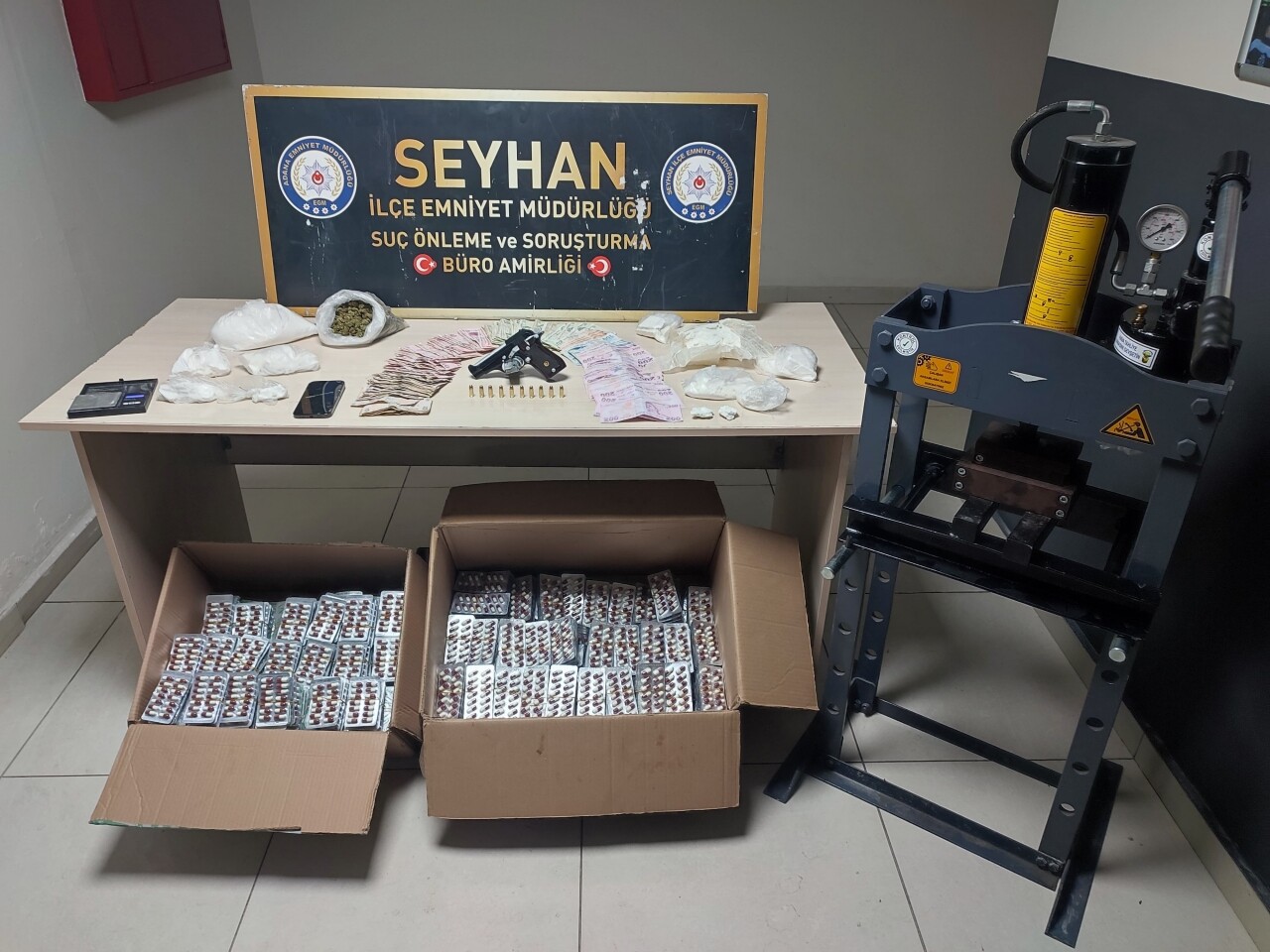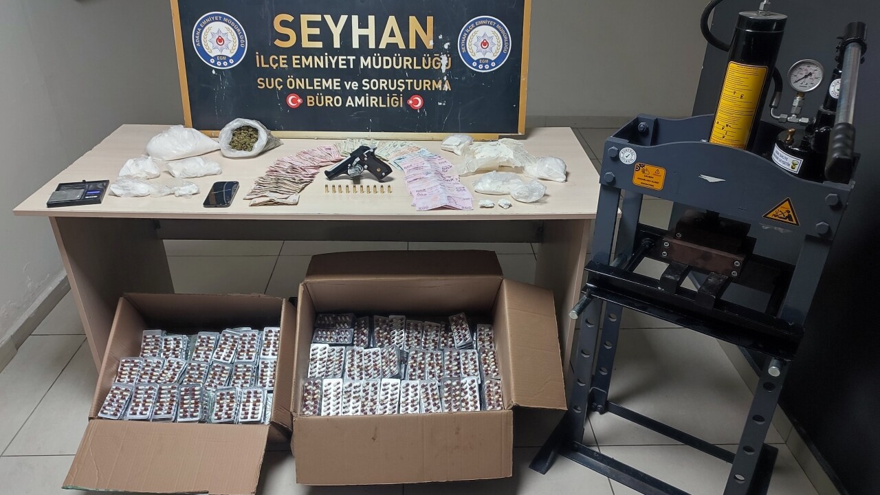 Adreste 1 kilo 920 gram kokain, 12 bin 992 uyuşturucu hap, 96 gram esrar, ruhsatsız tabanca, hassas terazi ve uyuşturucu paketlerinin preslenmesinde kullanılan makine ele geçirildi.