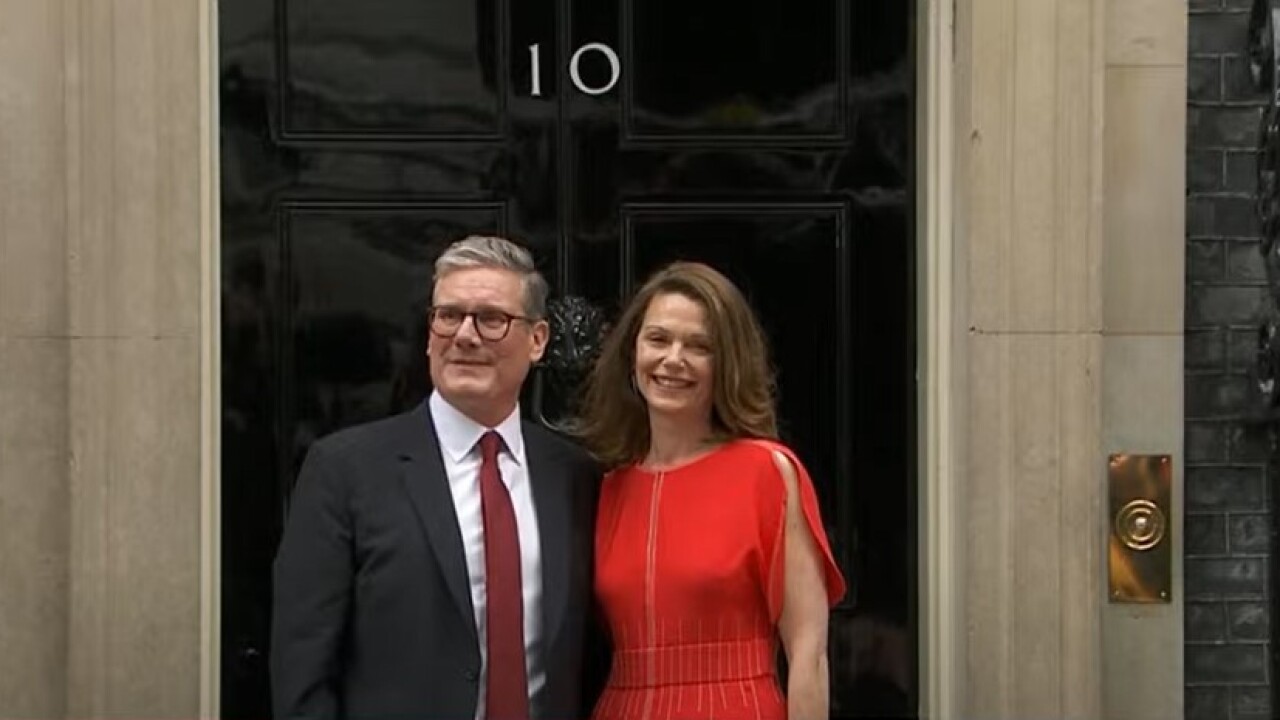 İşçi Partisi lideri ve yeni Başbakan Sir Keir Starmer ve eşi Victoria, 5 Temmuz 2024 tarihinde İngiltere'nin başkenti Londra'da İşçi Partisi'nin ezici seçim zaferinin ardından 10 Downing Street'e girerken destekçilerini selamladı.