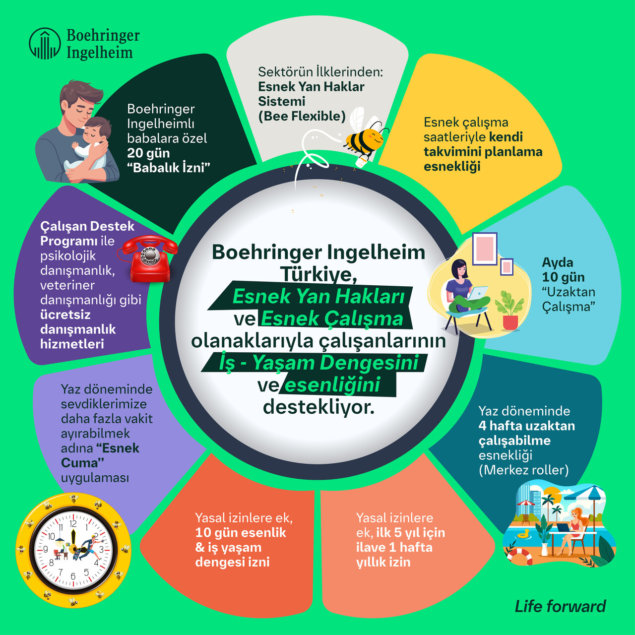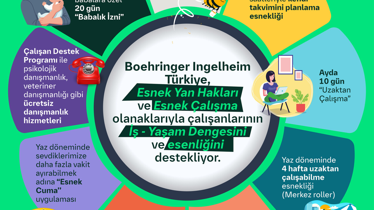 Çalışan esenliğini ve mutluluğunu sürdürülebilir kılmak amacıyla değişen koşullara ve ihtiyaçlara göre pek çok yenilikçi modeli hayata geçirmeye devam eden şirket, son olarak her yıl yaz aylarında hayata geçirdiği “Esnek Cuma” uygulamasını devreye aldı. Çalışanlar bu uygulama ile Haziran, Temmuz ve Ağustos aylarında hafta sonuna erken ve keyifli bir başlangıç yapmak adına Cuma günleri mesailerini saat 15:00'te tamamlıyorlar. Böylece çalışanlar ofisten eve dönerken trafiğe takılmıyor, yenilenmek ve sevdikleriyle güzel vakit geçirmek için hafta sonuna daha erken başlayabiliyorlar. Yanı sıra, çalışanların yaz aylarında daha esnek çalışma koşullarına sahip olmaları için ek uygulamalar da sunuluyor. Çalışanlar Temmuz ve Ağustos aylarında 4 hafta istedikleri yerden çalışabiliyorlar. Bununla birlikte, şirket çalışanları yıl boyunca ayda 10 gün uzaktan çalışma imkanına sahipler.