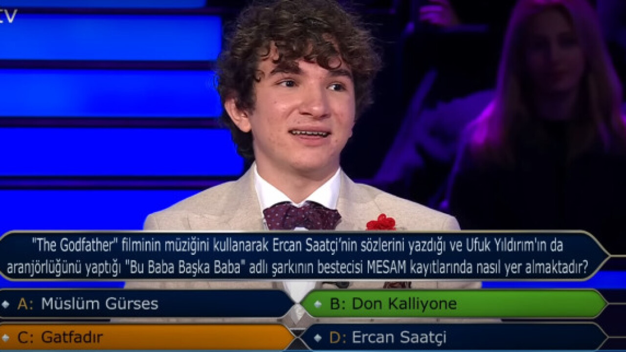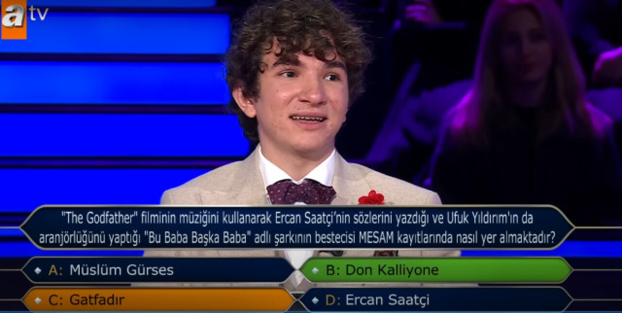 ATV ekranlarının sevilen yarışma programı Kim Milyoner Olmak İster, yeni sezonda heyecan dolu bölümleriyle izleyicileri ekran başına kilitliyor. Oktay Kaynarca’nın sunuculuğunda yayınlanan program, her hafta ilginç ve bilgi dolu sorularıyla dikkat çekmeye devam ediyor. Son bölümde sorulan "The Godfather" filminin müziğini kullanarak Ercan Saatçi'nin sözlerini yazdığı ve Ufuk Yıldırım'ın aranjörlüğünü yaptığı "Bu Baba Başka Baba" adlı şarkının bestecisi MESAM kayıtlarında nasıl yer almaktadır? sorusu, izleyicilerin merakını cezbetti. Peki, bu ilginç sorunun doğru cevabı ne?