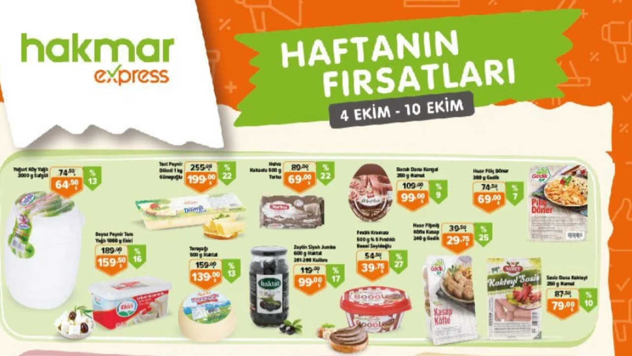 Hakmar aktüel kataloğunda bu hafta gıda ürünlerinden temizlik malzemelerine kadar geniş bir yelpazede indirimler mevcut. Özellikle temel gıda ürünlerinde en çok tüketilenlerin yer alması dikkat çekiyor. Uygun fiyata un, yağ, süt ve bakliyat gibi temel ihtiyaç ürünleriyle alışveriş bütçenizi rahatlatmanızı hedefliyor. 4 Ekim Hakmar kataloğunda yer alan ürünler arasında kasap köfte yüzde 25 oranında indirimle 29,75 TL'den tüketiciye sunuluyor. Ayrıca sucuk dana kangal 99,00 TL, hazır piliç döner 69,00 TL, 500 gr tereyağı 139,00 TL, Torku helva 69,00 TL şeklinde.