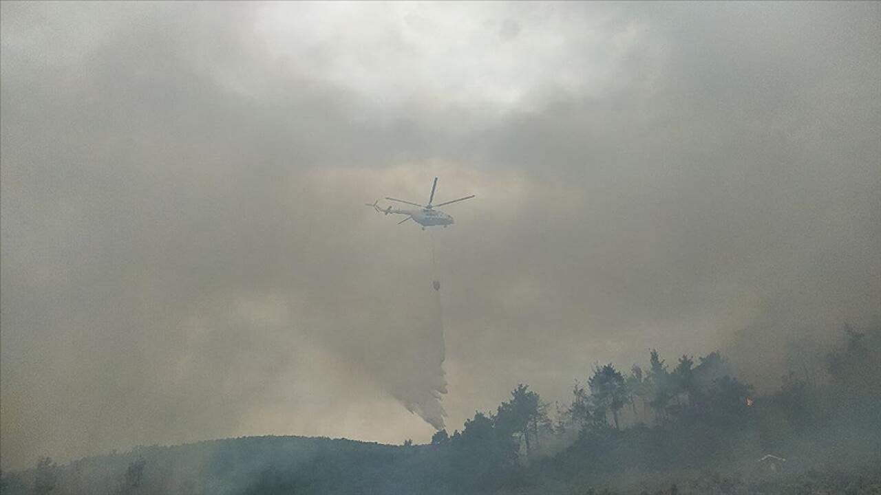 Zaman zaman şiddetli rüzgarın etkili olduğu bölgede arazözler ve diğer araçlarla yürütülen söndürme çalışmasına havadan iki helikopter ve bir uçakla destek veriliyor.