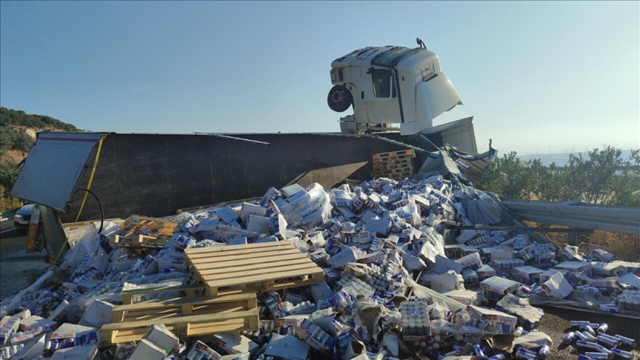 Yola saçılan metal kutulardaki enerji içecekleri, çalışanlar tarafından kenarda toplandıktan sonra bir kamyona yüklendi. Tır ise vinç yardımıyla bulunduğu yerden kaldırıldı.